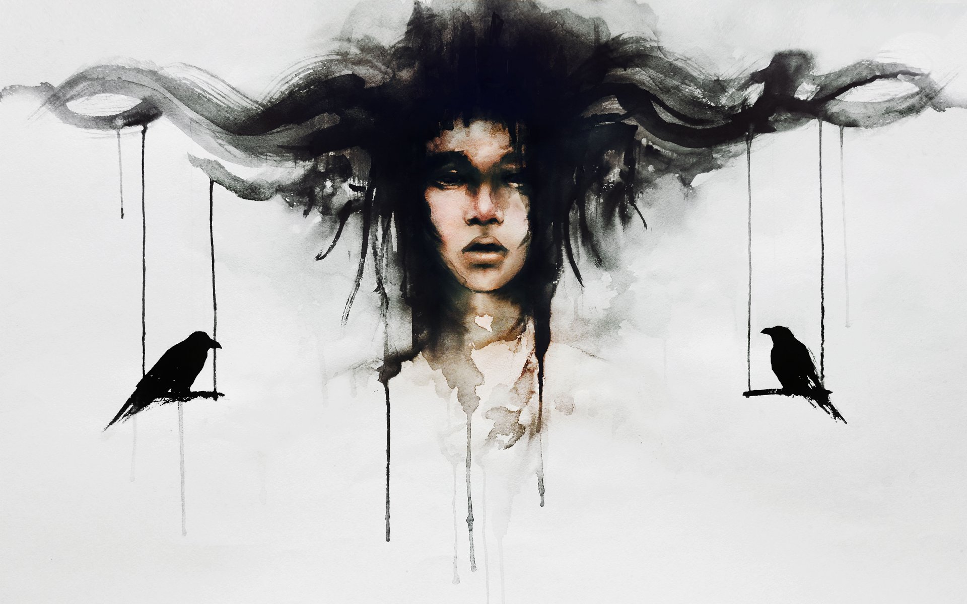 Retrato de una chica con el pelo negro en forma de un columpio y un cuervo sentado en ellos
