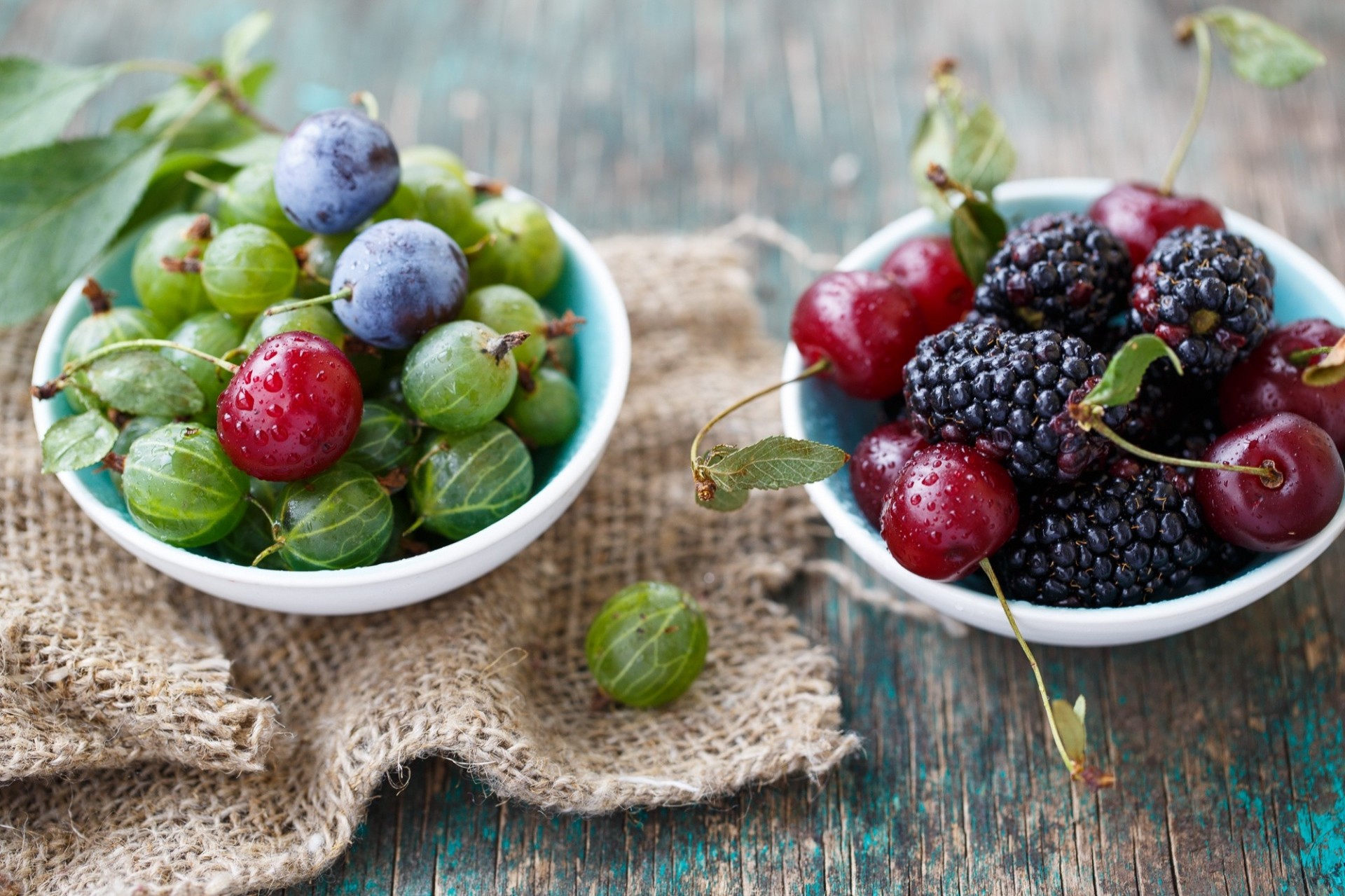 Cuatro copas de vino en las que las bayas de ceniza de montaña