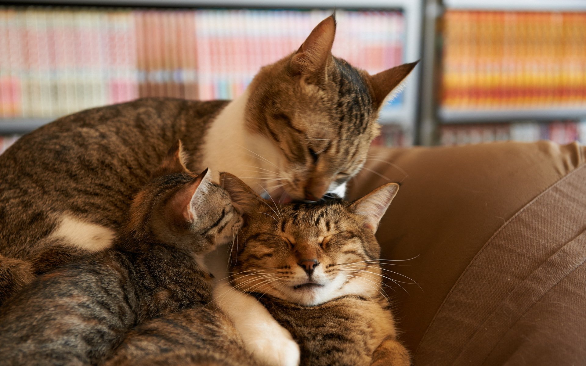 Interior moderno. sofá con almohadas y un gato rojo en él. gran biblioteca de libros, pinturas y caballete con pinturasInterior moderno. Sofá con almohadas y un gato rojo en él. Gran biblioteca de libros, pinturas y caballete con pinturas