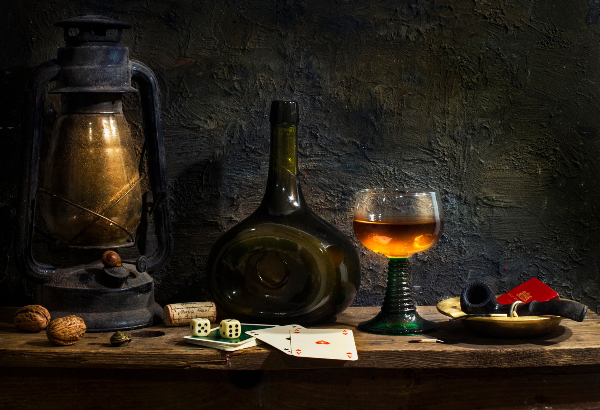 Sobre un fondo marrón, un San Bernardo y dos copas de vino