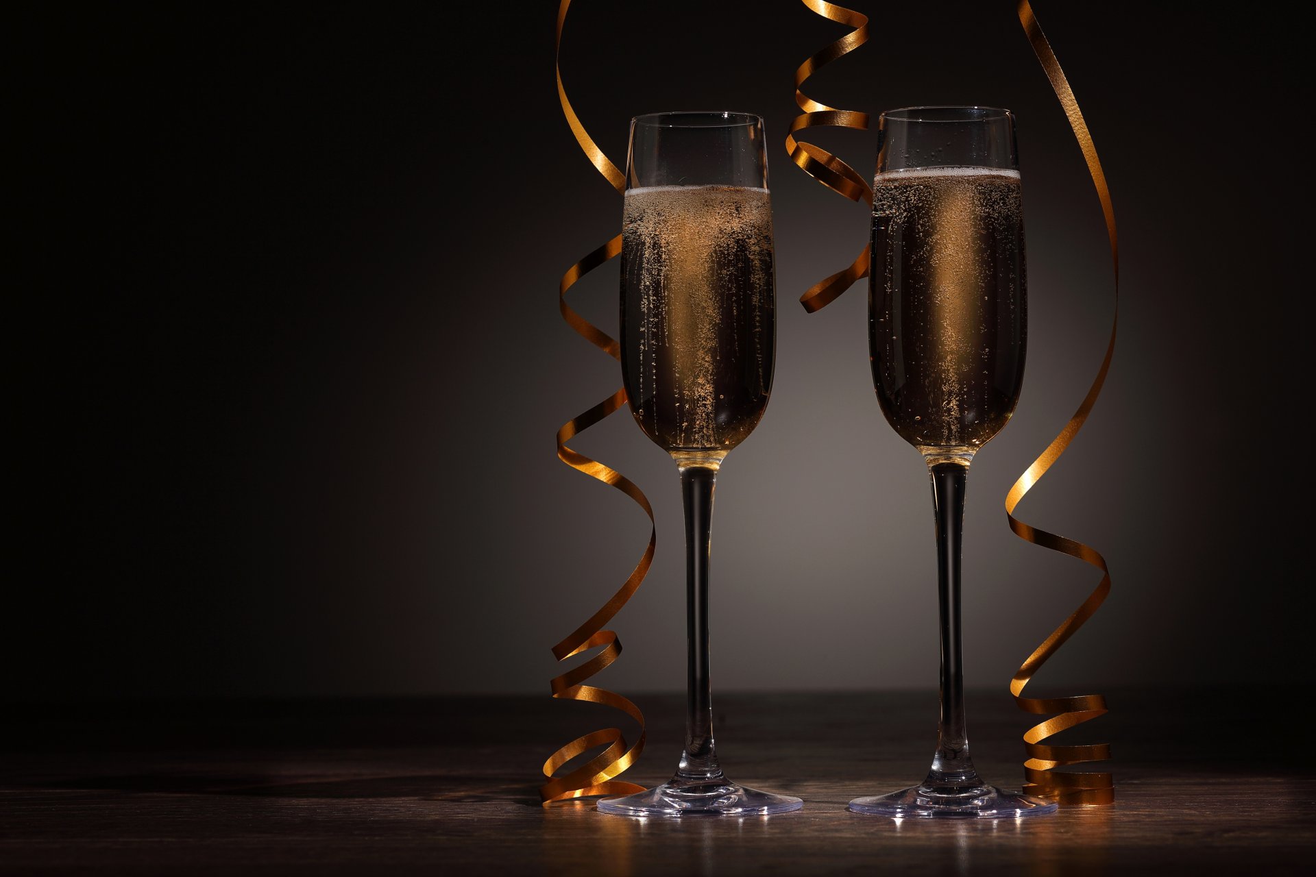 Un ramo de flores junto a dos copas de vino y una botella de champánUn ramo de flores junto a dos copas de vino y una botella de champán