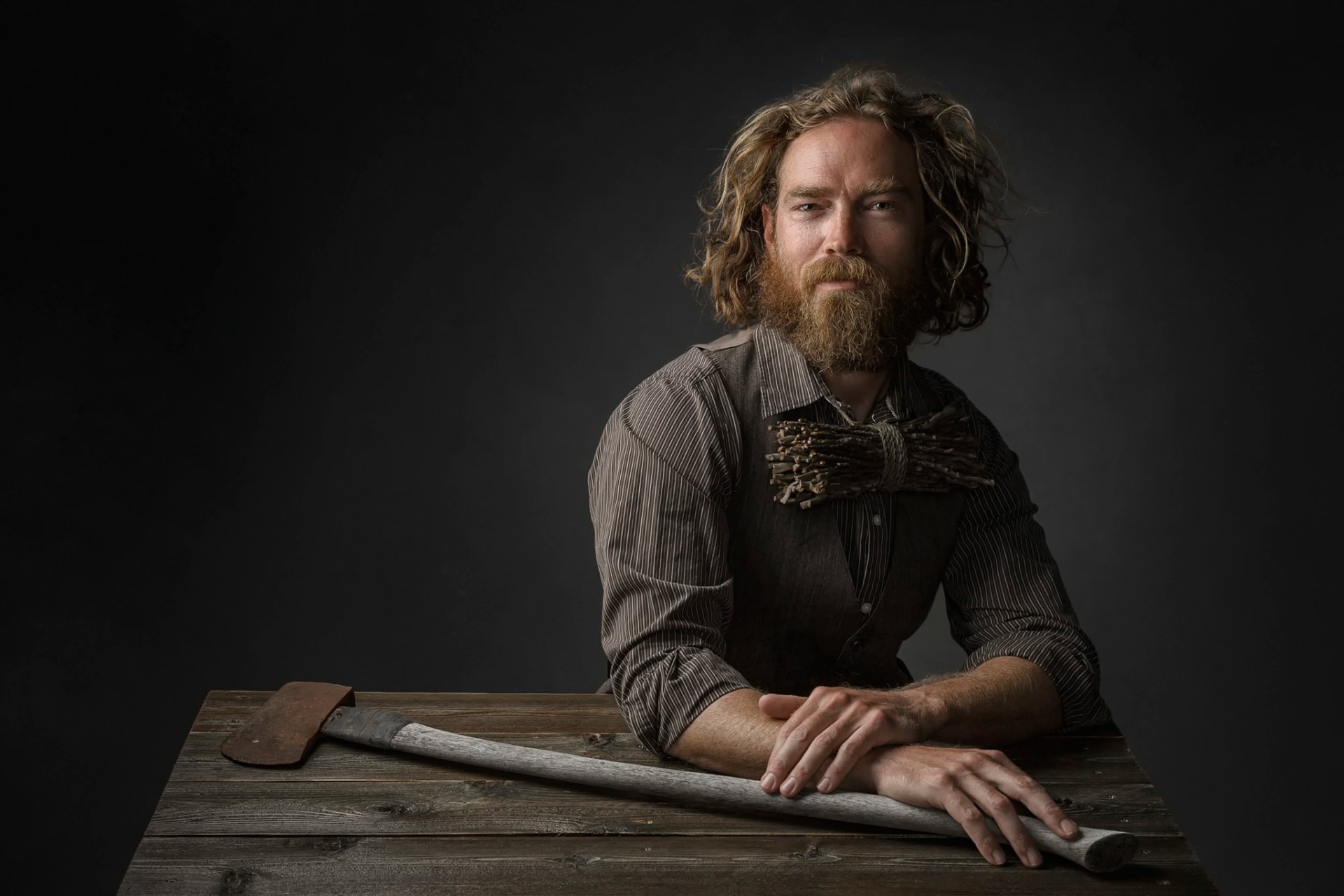 Hombre barbudo con camisa sostiene un hacha
