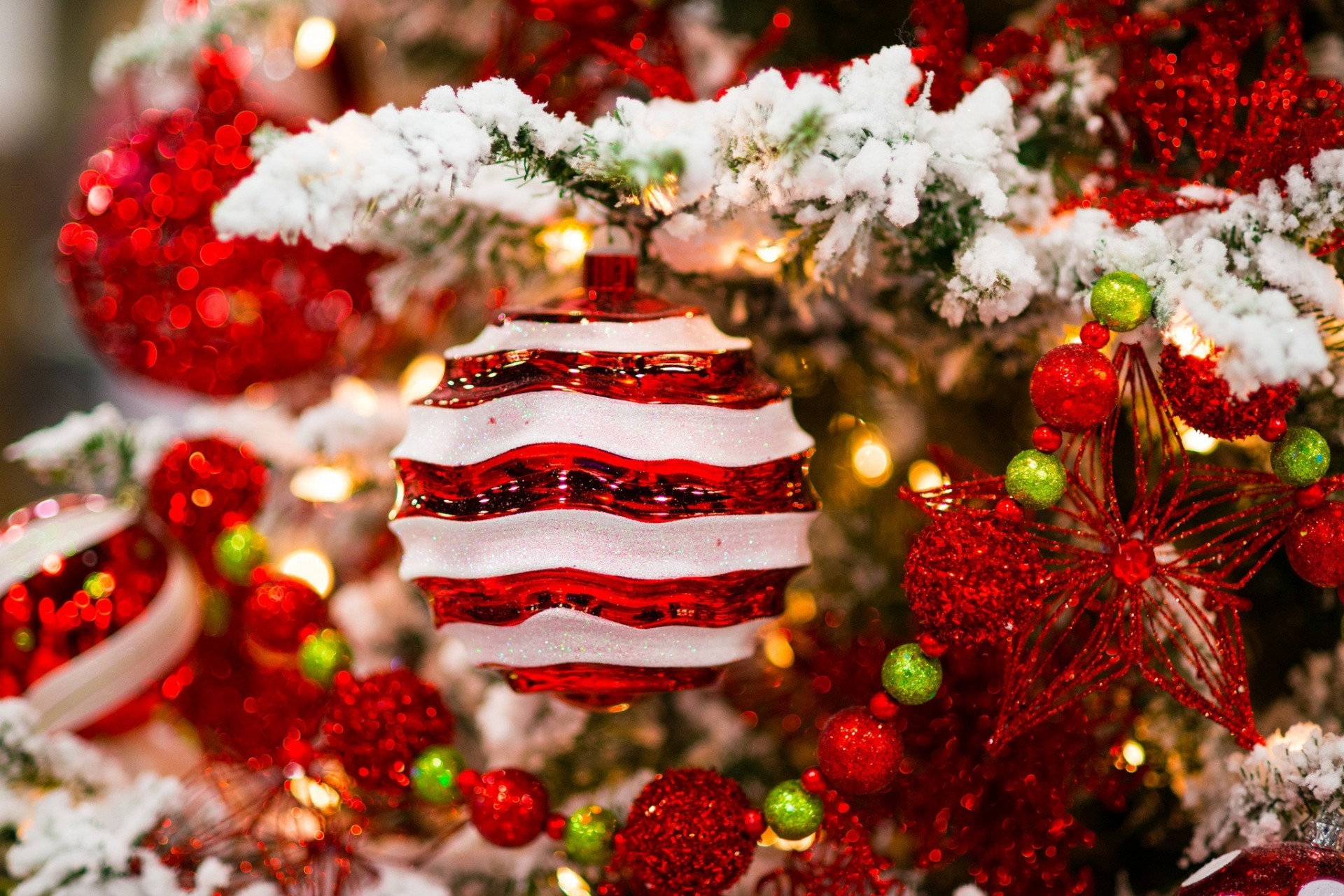 El árbol de Navidad está decorado con juguetes rojos con cuentas y corazones