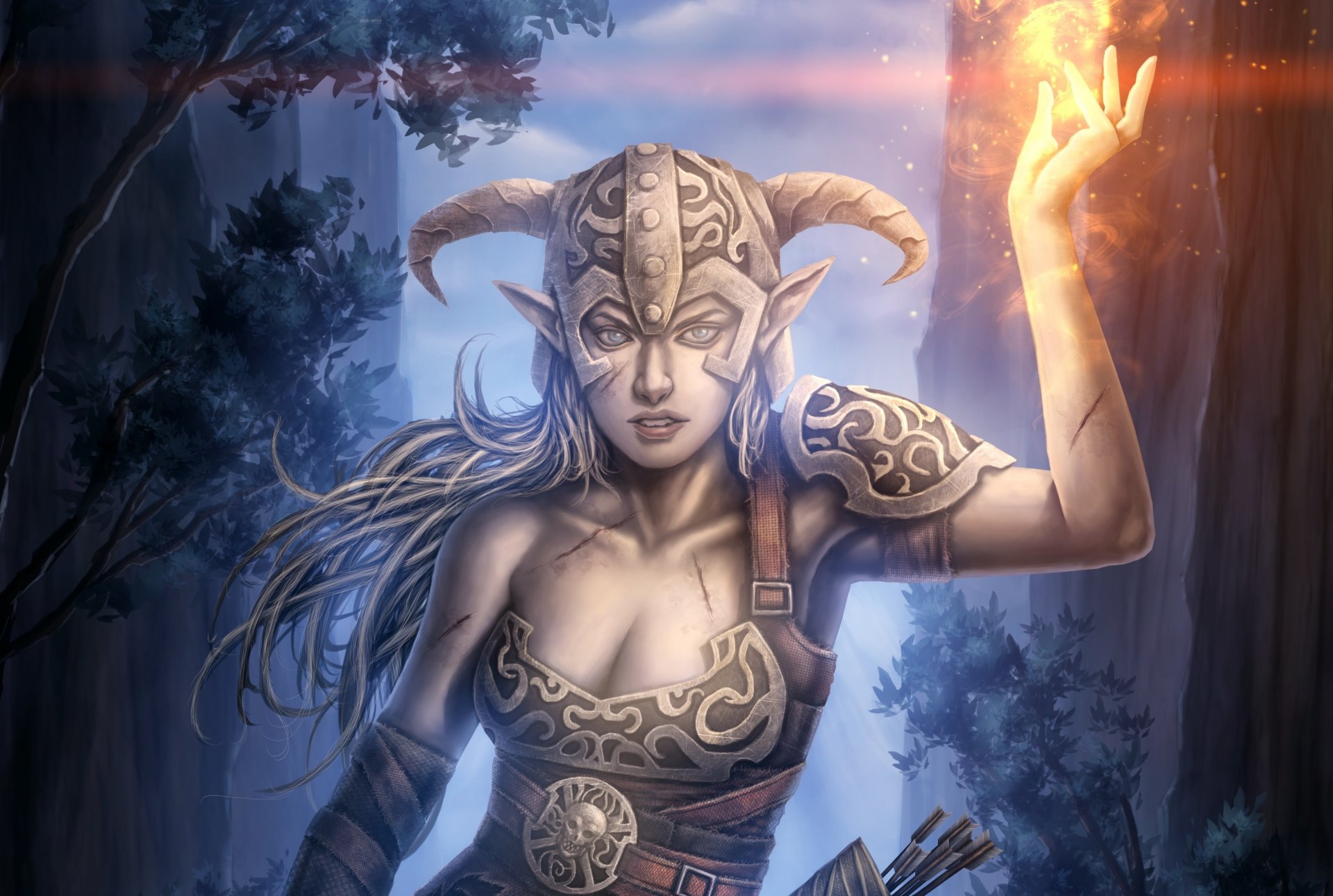 Entre las montañas, una chica en un casco con cuernos sostiene un fuego en su manoEntre las montañas, una chica en un casco con cuernos sostiene un fuego en su mano