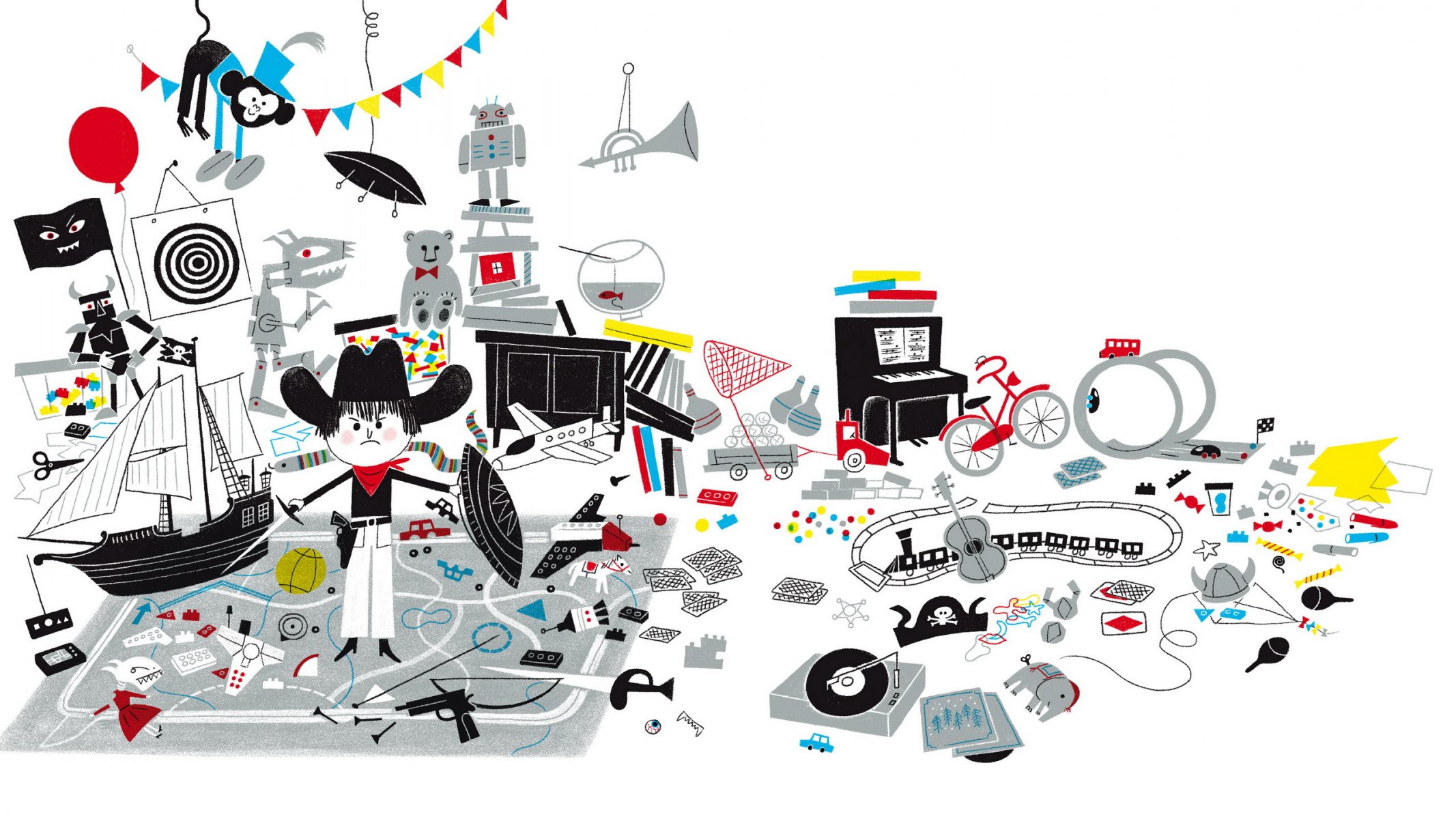 Dibujo de un lío en la guardería de un niño con un traje de vaqueroDibujo de un lío en la guardería de un niño con un traje de vaquero