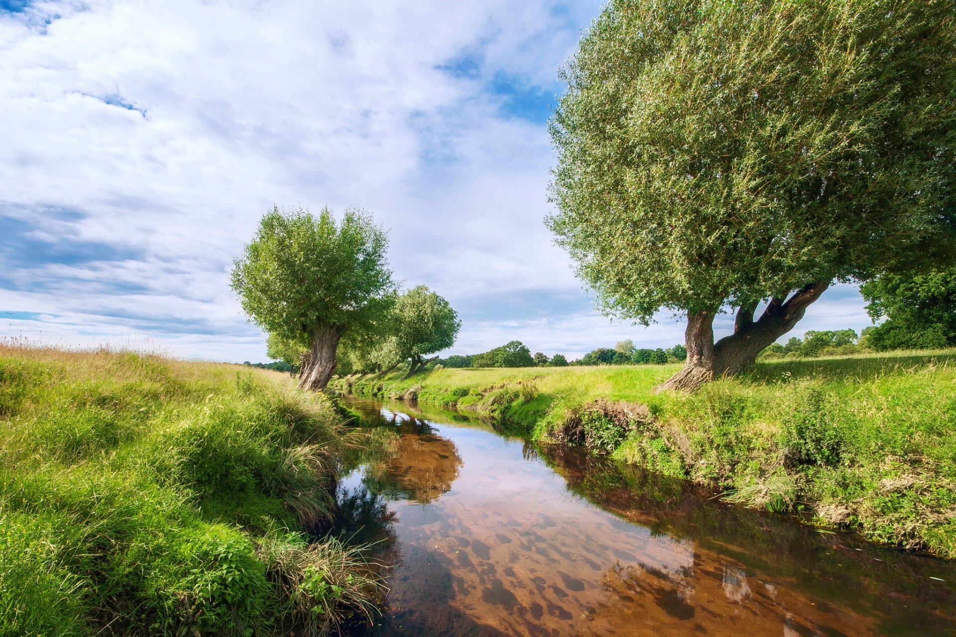 Puente en el fondo de la puesta de sol. Río tranquilo. Nubes