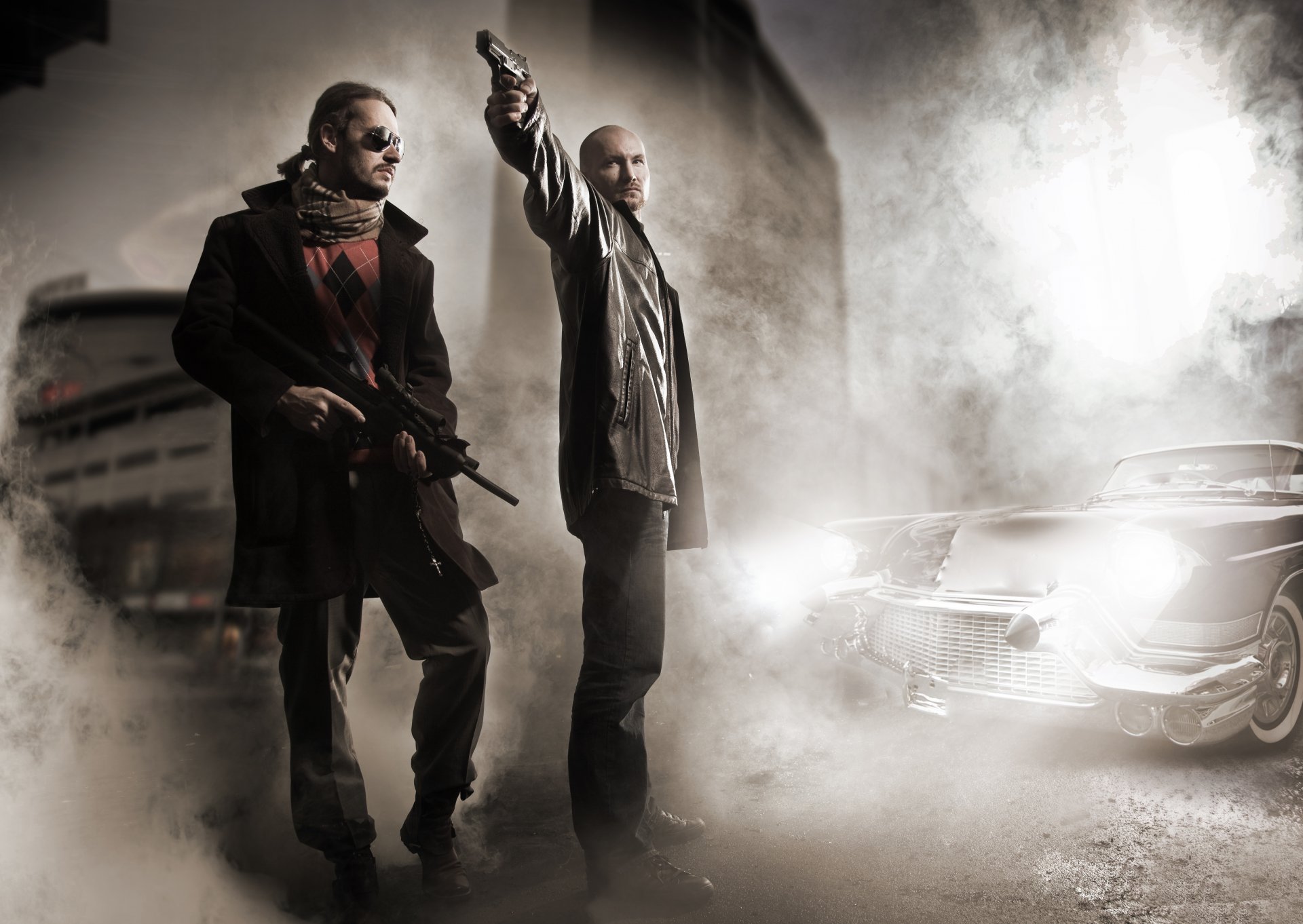 Dos hombres en los faros de un coche