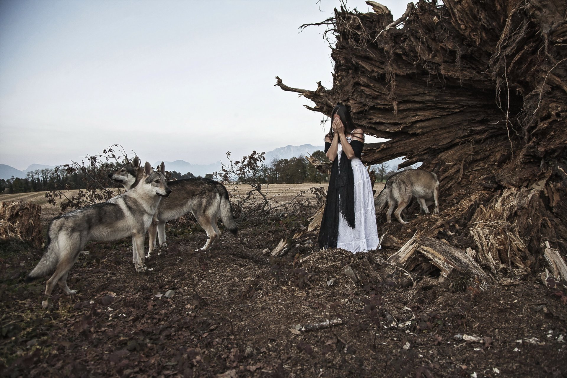 Una manada de lobos en el bosque de invierno se abren paso a través del ríoUna manada de lobos en el bosque de invierno se abren paso a través del río