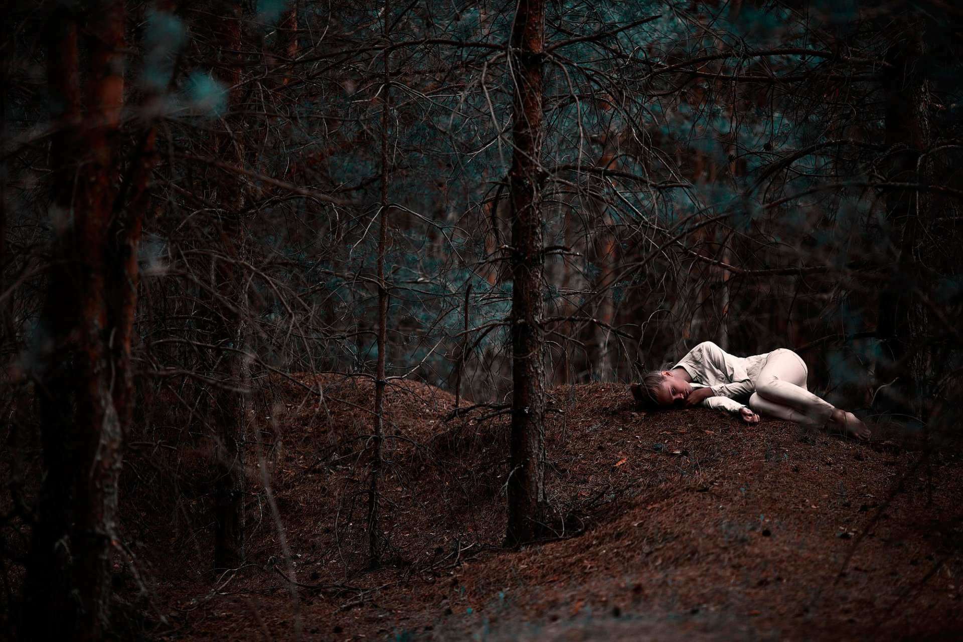 Chica durmiendo en una maleta en un bosque misteriosoChica durmiendo en una maleta en un bosque misterioso