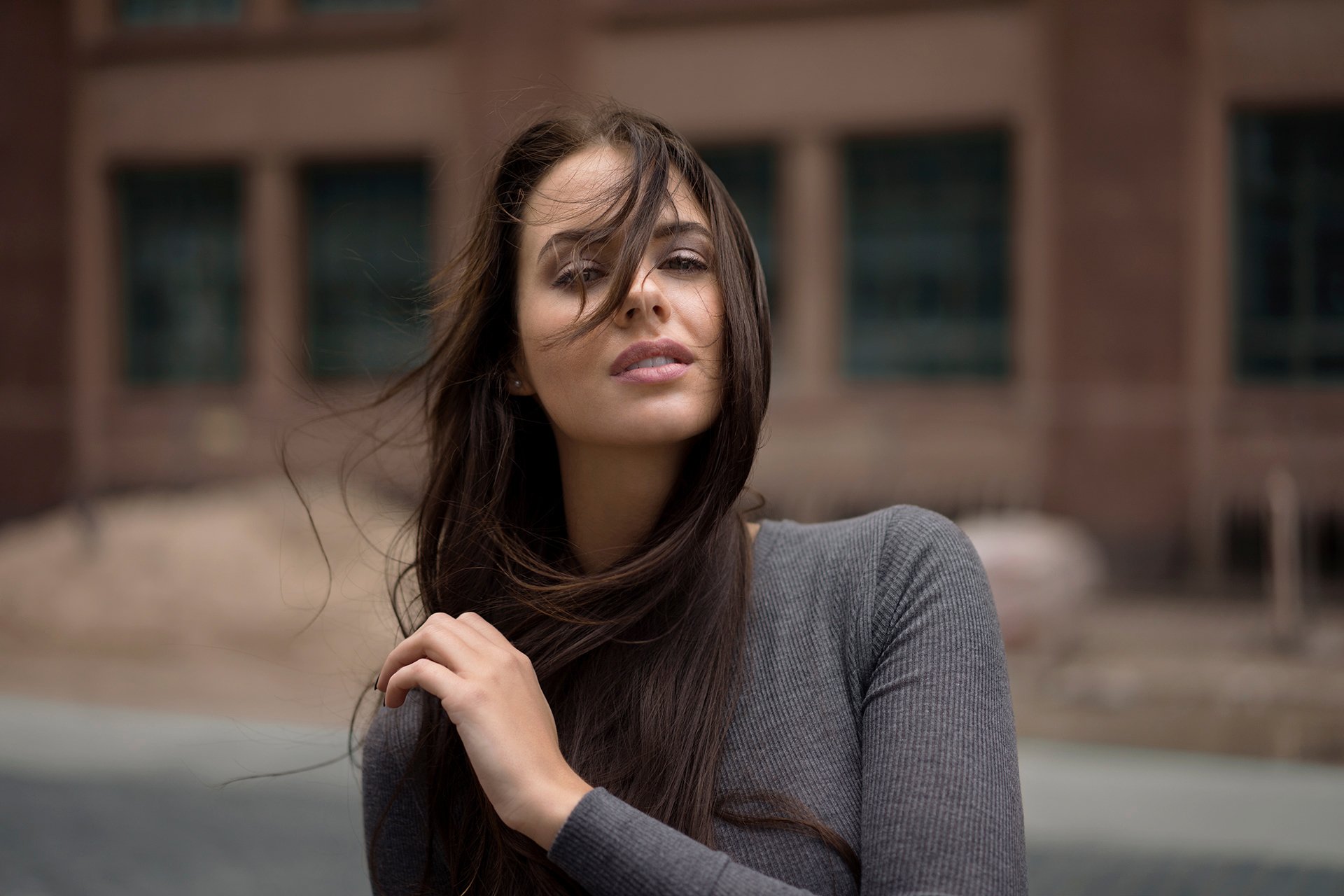 Chica posando en el viento en el fondo de un edificioChica posando en el viento en el fondo de un edificio