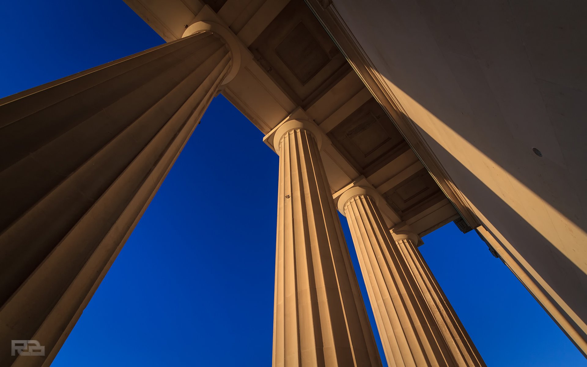 Las columnas del edificio de la ciudad se elevan hacia el cieloLas columnas del edificio de la ciudad se elevan hacia el cielo