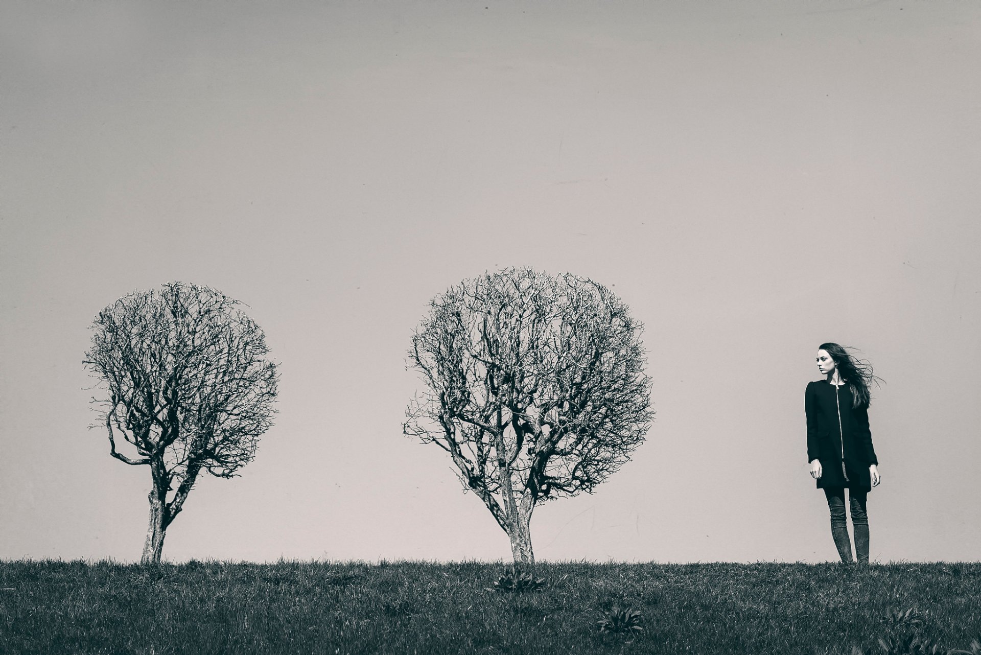 Foto en blanco y negro de una niña y dos árboles solitariosFoto en blanco y negro de una niña y dos árboles solitarios