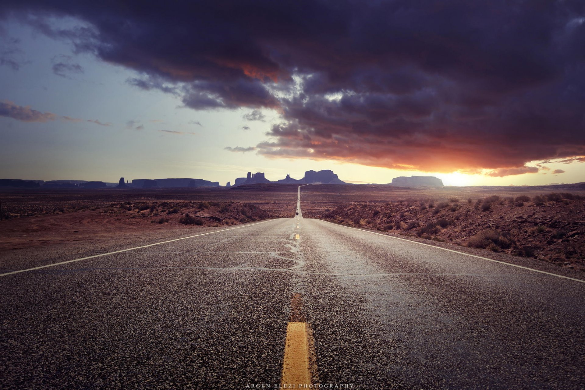 Puesta de sol en la avenida de los monumentos en el camino que conduce a las montañasPuesta de sol en la avenida de los monumentos en el camino que conduce a las montañas