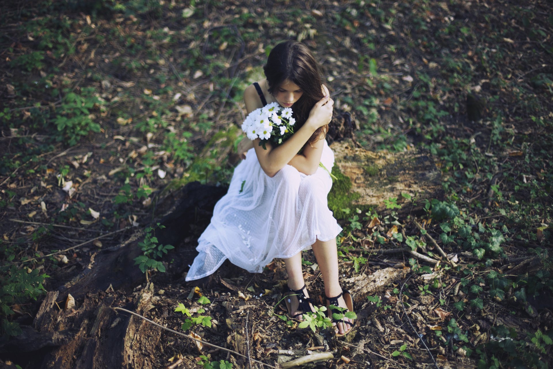 Una chica con un vestido rojo, con un perro. Proogulka en el bosque
