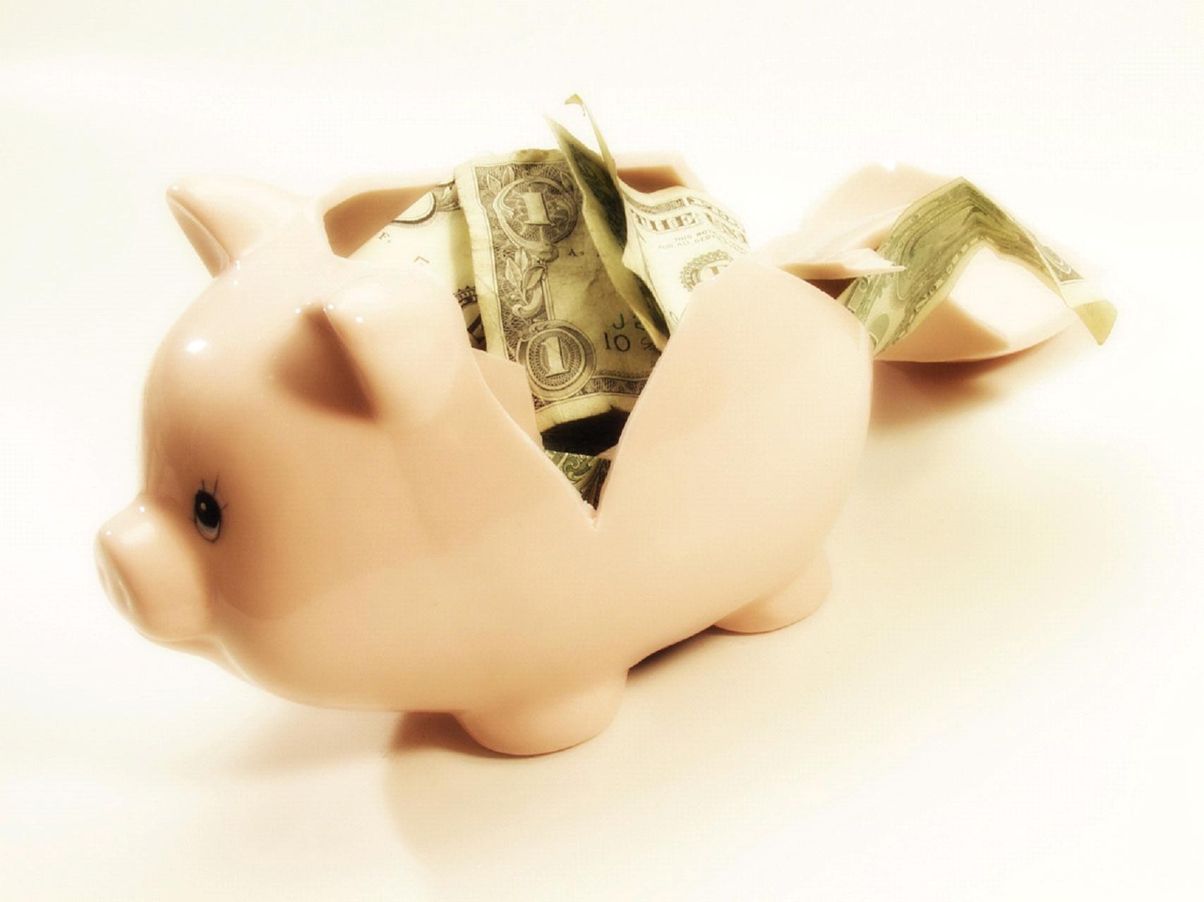 Cerdo hucha rota con dólares en el interior sobre un fondo blancoCerdo hucha rota con dólares en el interior sobre un fondo blanco
