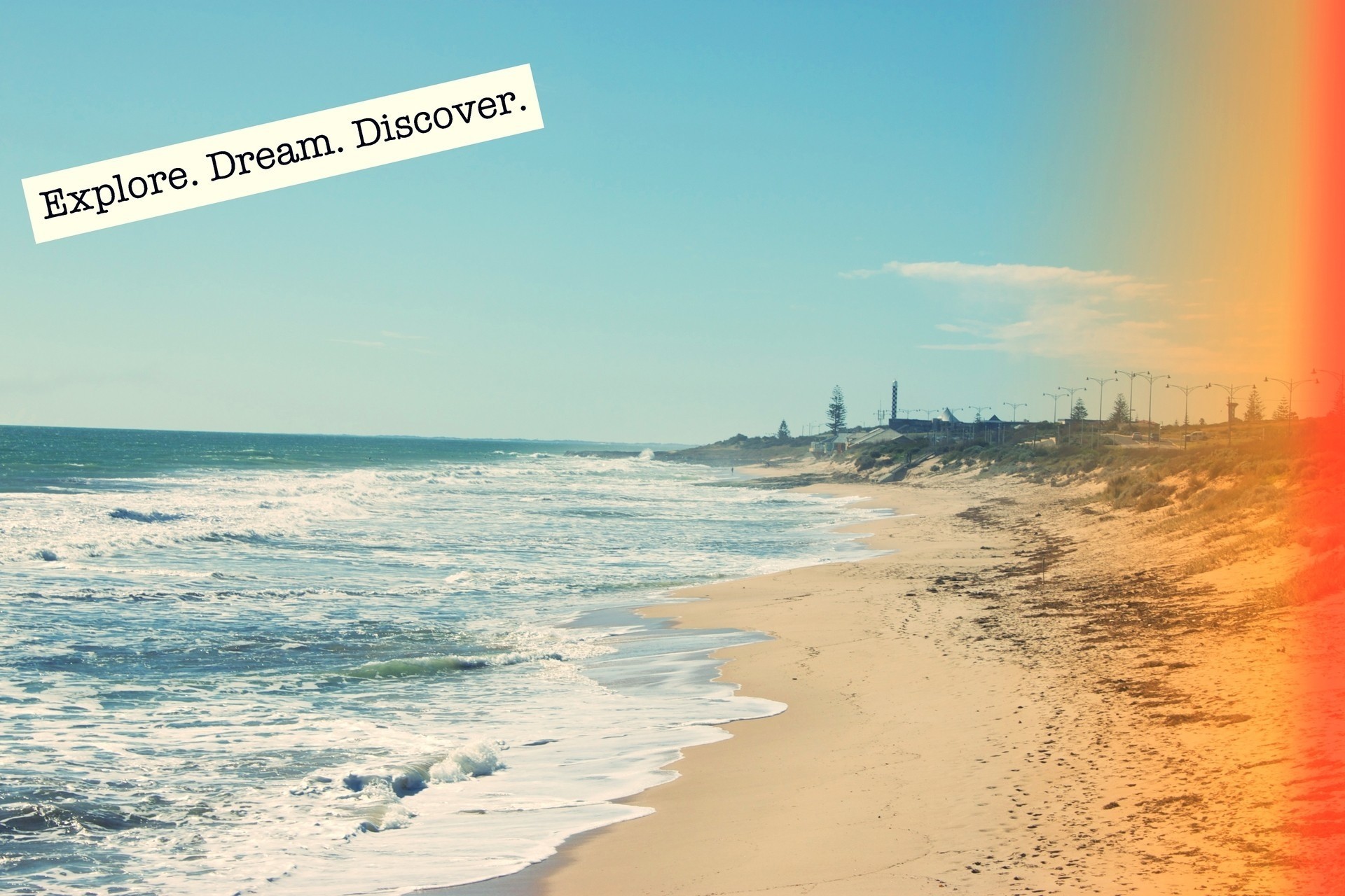 La inscripción en la foto con la imagen de la playa de arena del marLa inscripción en la foto con la imagen de la playa de arena del mar