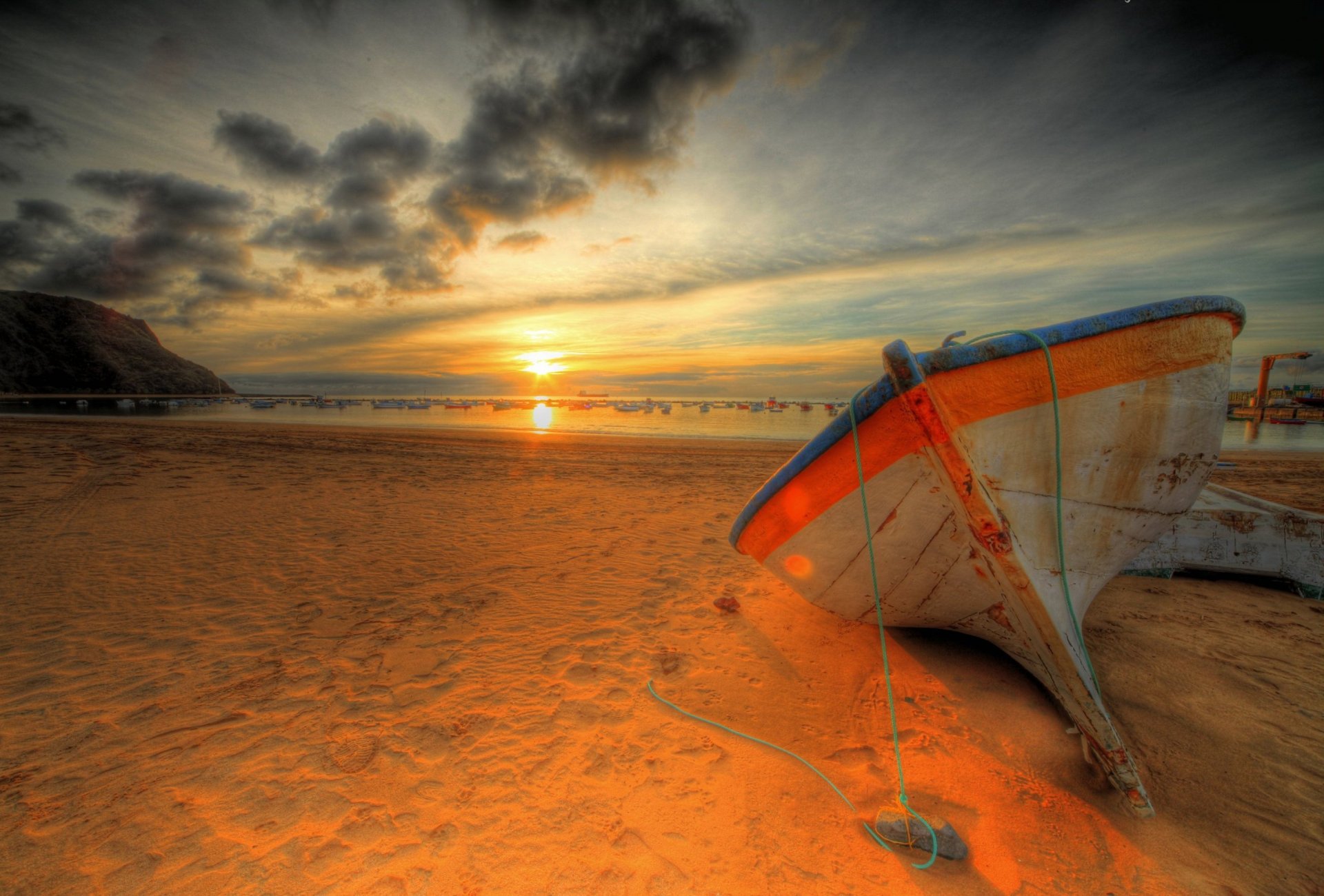 El barco se encuentra en la orilla del mar en los rayos del atardecerEl barco se encuentra en la orilla del mar en los rayos del atardecer