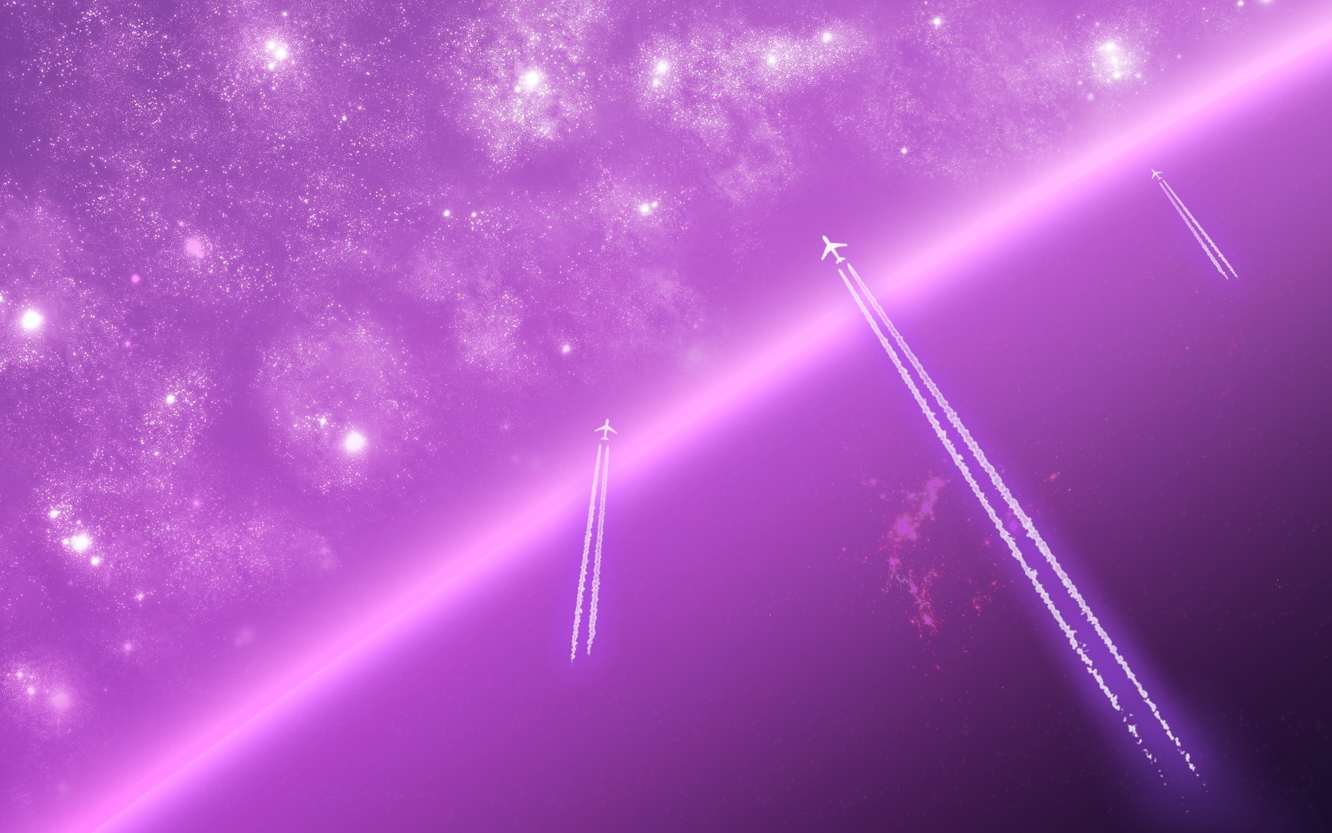 Imagen de fantasía del cielo en tonos lila con estrellas y aviones