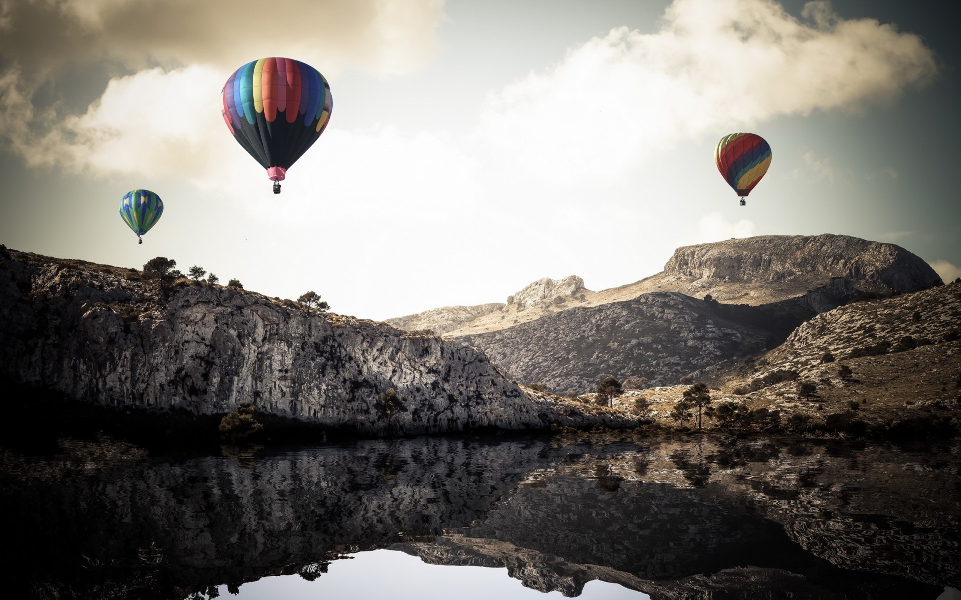 Paisaje de globos deportivos flotando sobre un lago de montañaPaisaje de globos deportivos flotando sobre un lago de montaña