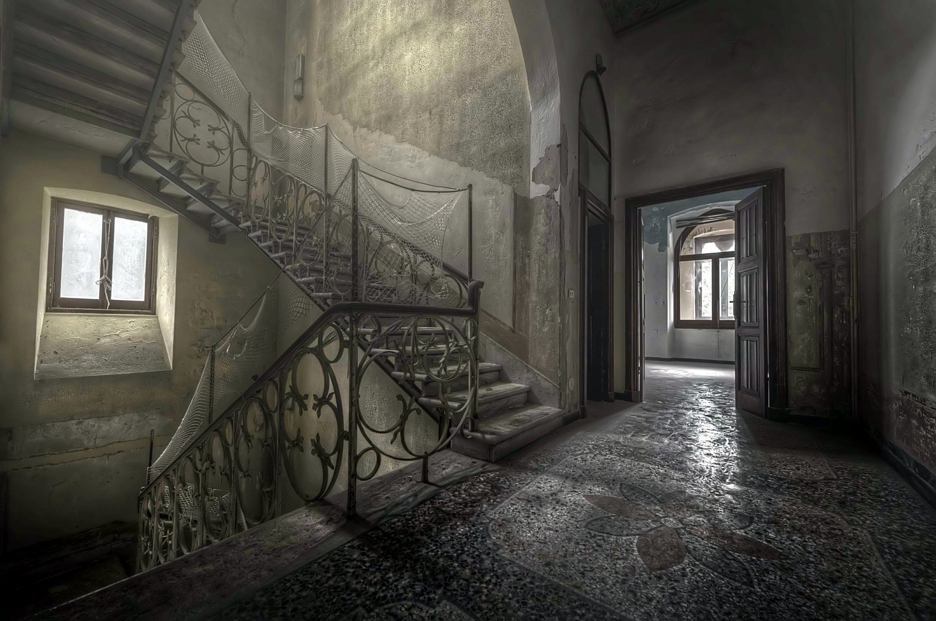 Una vieja escalera en la entrada de un edificio en ruinasUna vieja escalera en la entrada de un edificio en ruinas