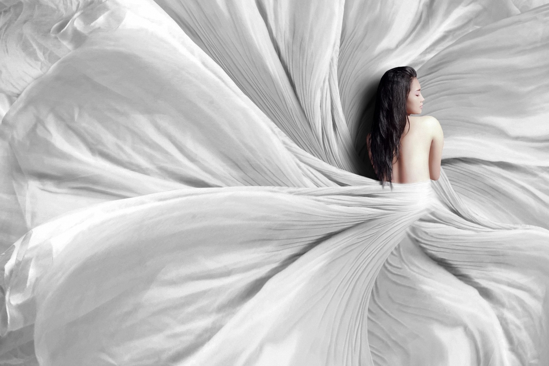 Una chica corre en un vestido blanco y con alas detrás de su espaldaUna chica corre en un vestido blanco y con alas detrás de su espalda