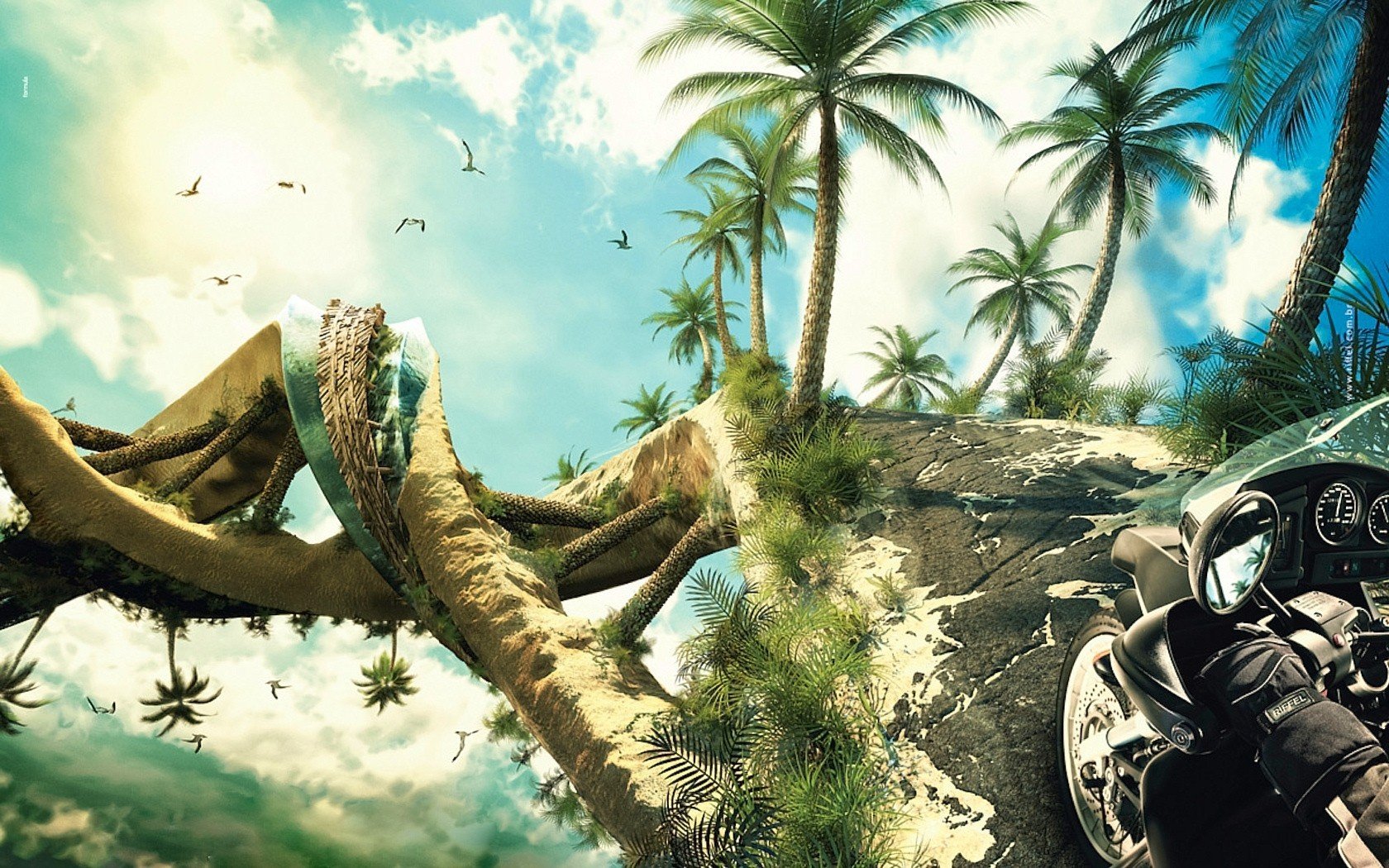 La moto viaja en espiral desde las palmeras