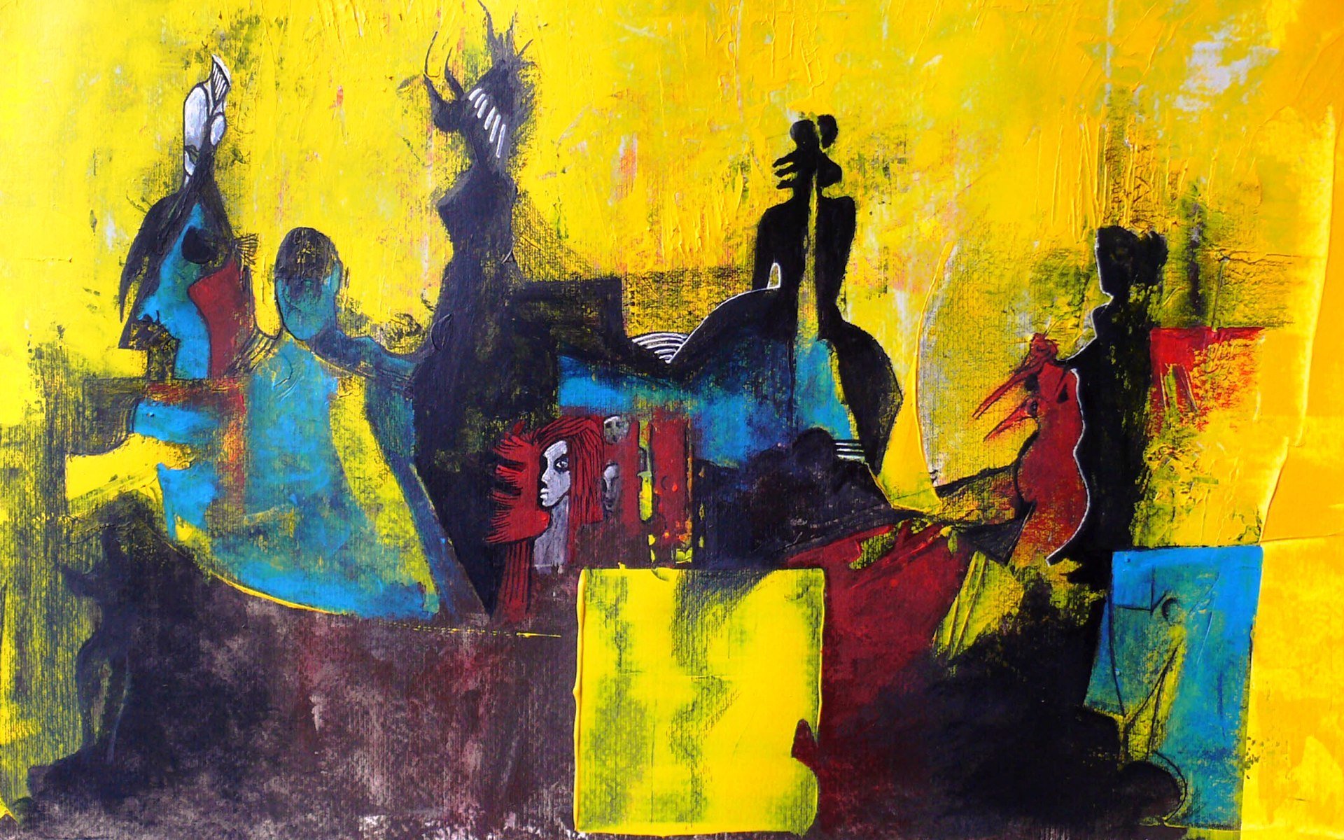 Pintura abstracta con siluetas negras sobre fondo amarilloPintura abstracta con siluetas negras sobre fondo amarillo