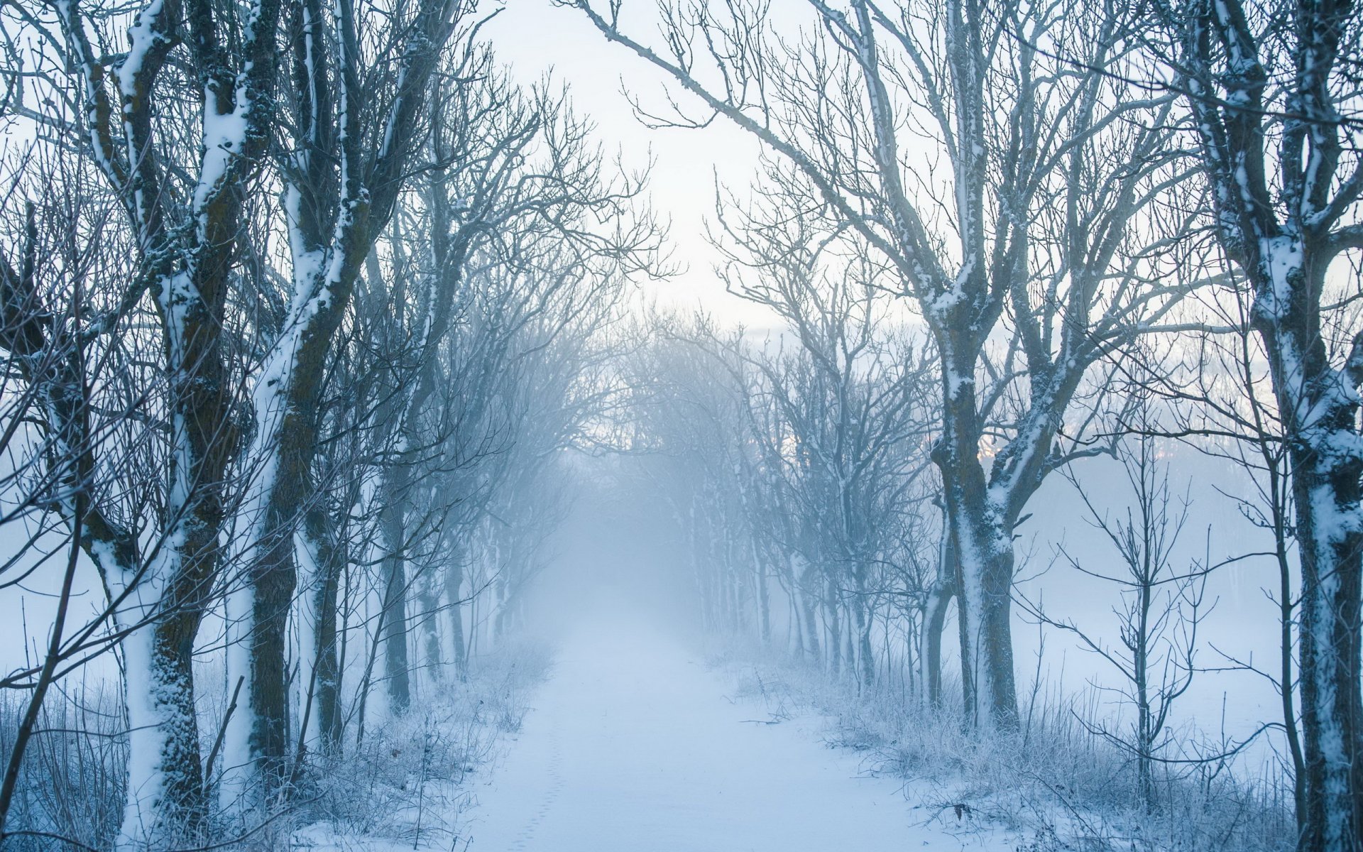 Un camino estrecho en el bosque de invierno brumosoUn camino estrecho en el bosque de invierno brumoso