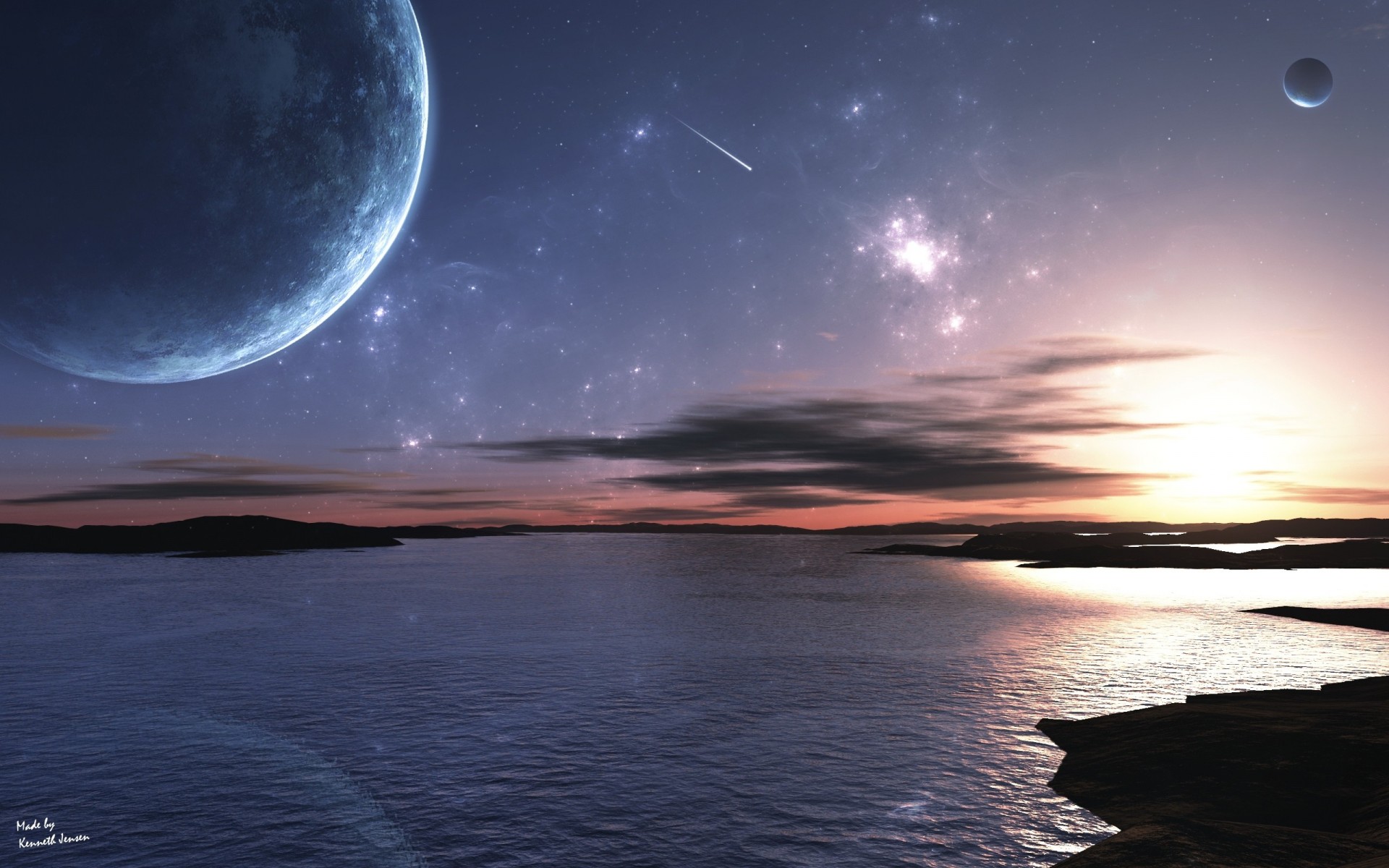 Planetas con una estrella brillante sobre las montañasPlanetas con una estrella brillante sobre las montañas