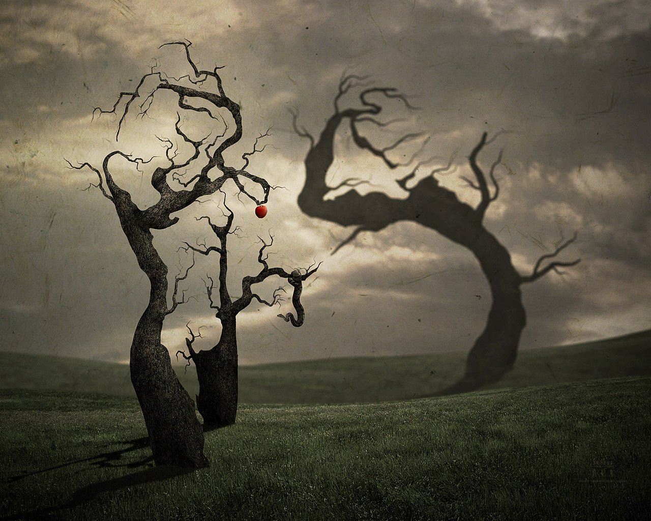 Árboles muertos en el campo y una manzana