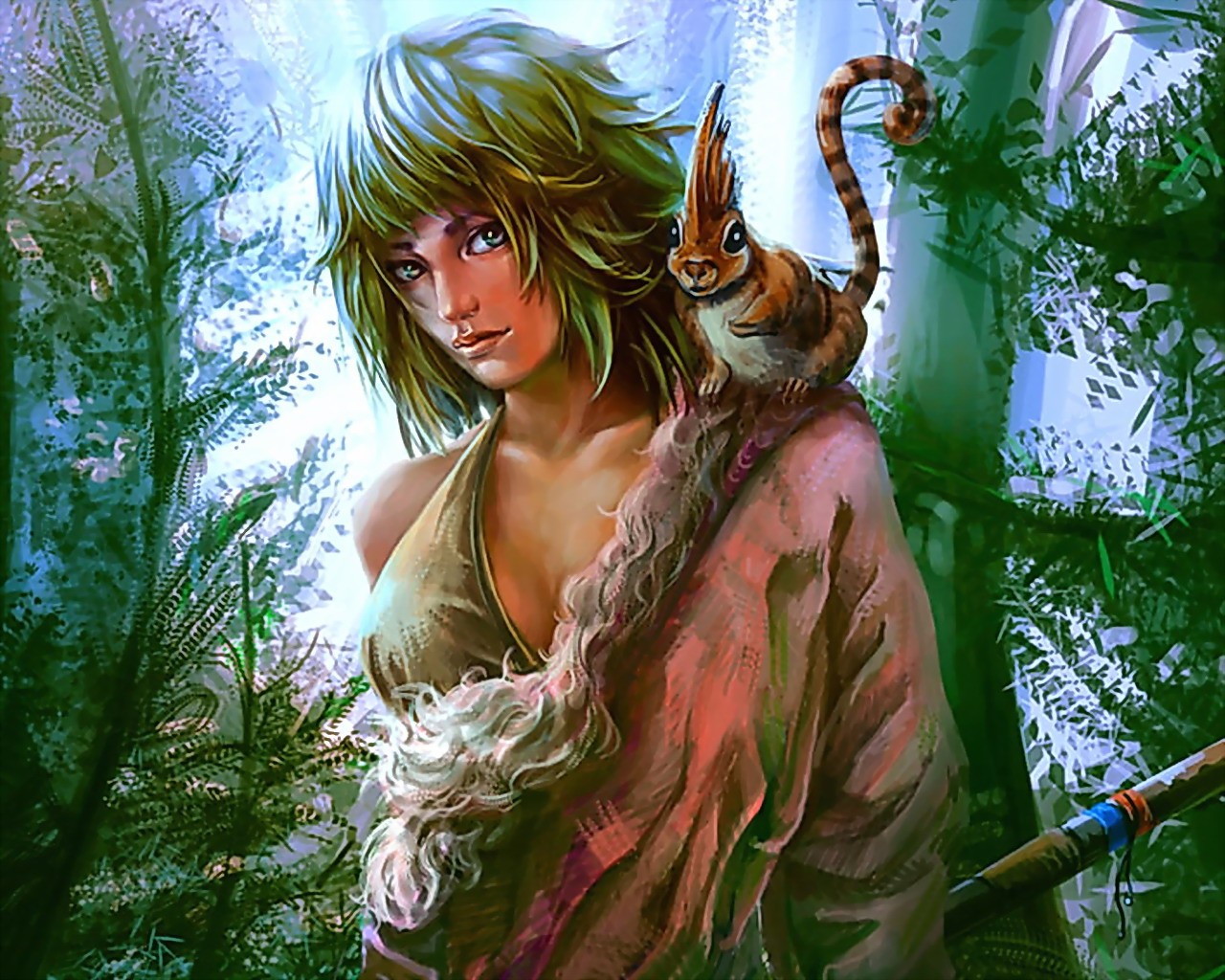 Chica cazadora en el bosque matorral con un amigo ardillaChica cazadora en el bosque matorral con un amigo ardilla