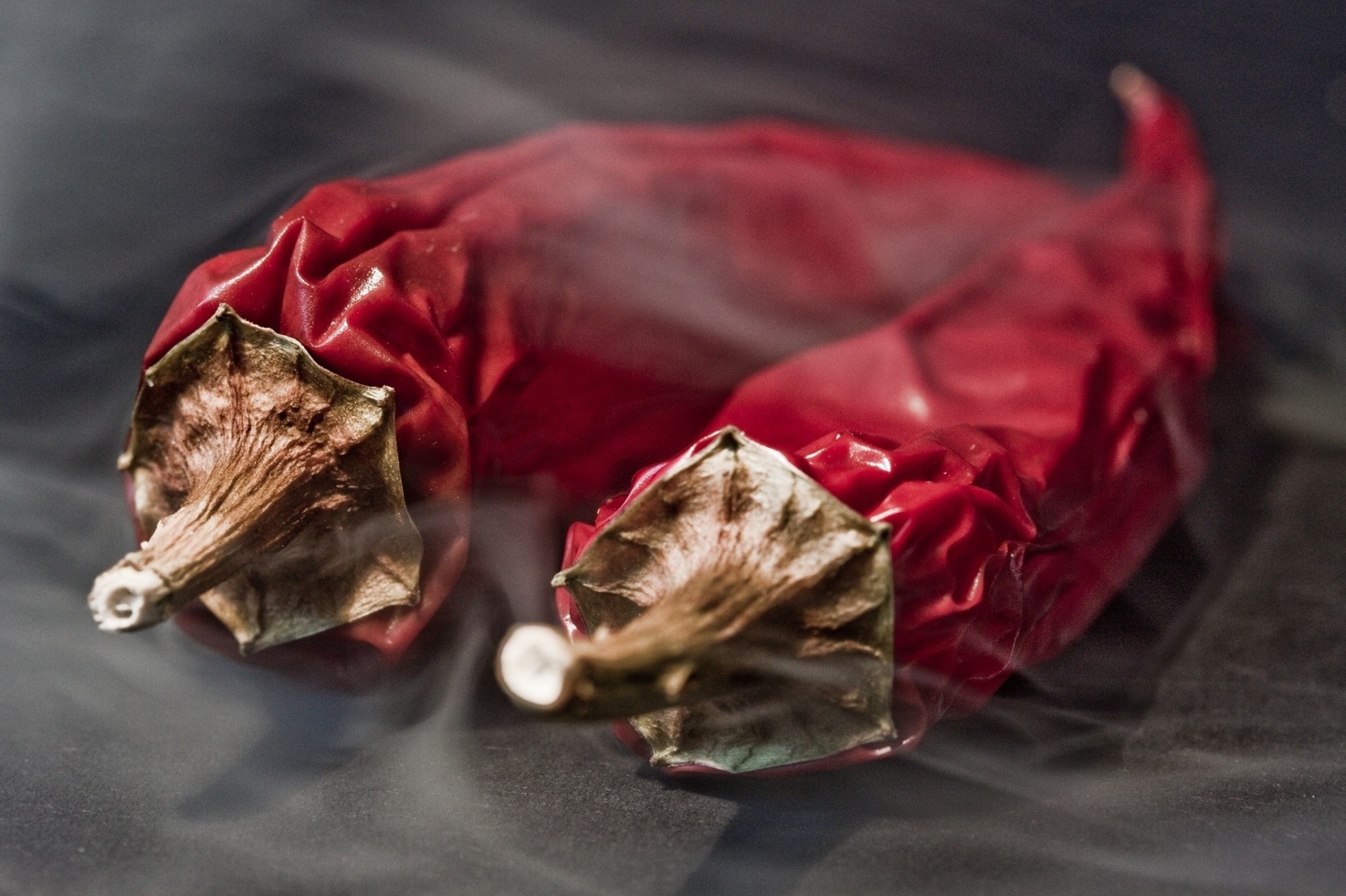 Hojas de árboles rojos brillantes en el bosque de niebla