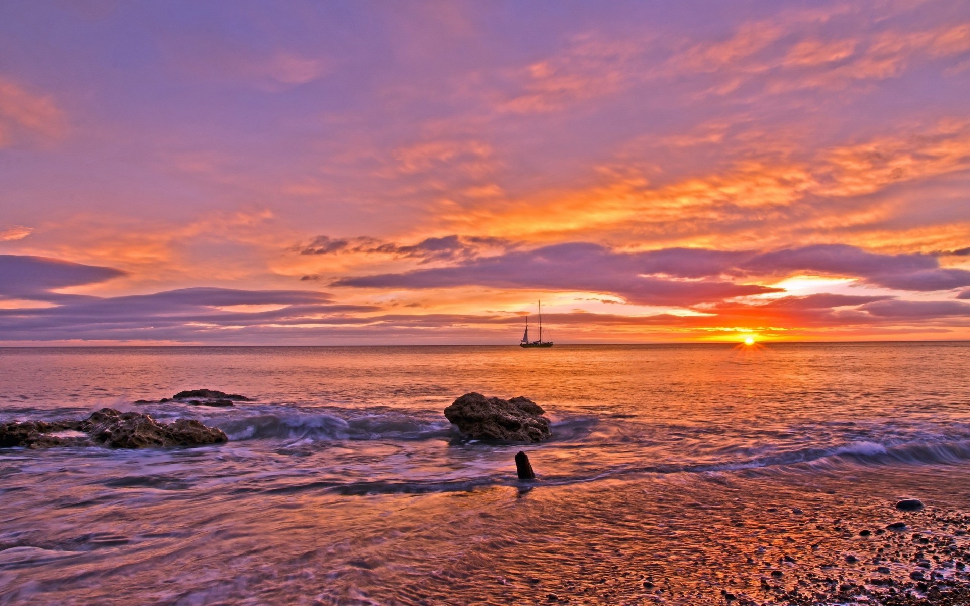 Velero lejos al atardecer. calma y serenidad del marVelero lejos al atardecer. Calma y serenidad del mar