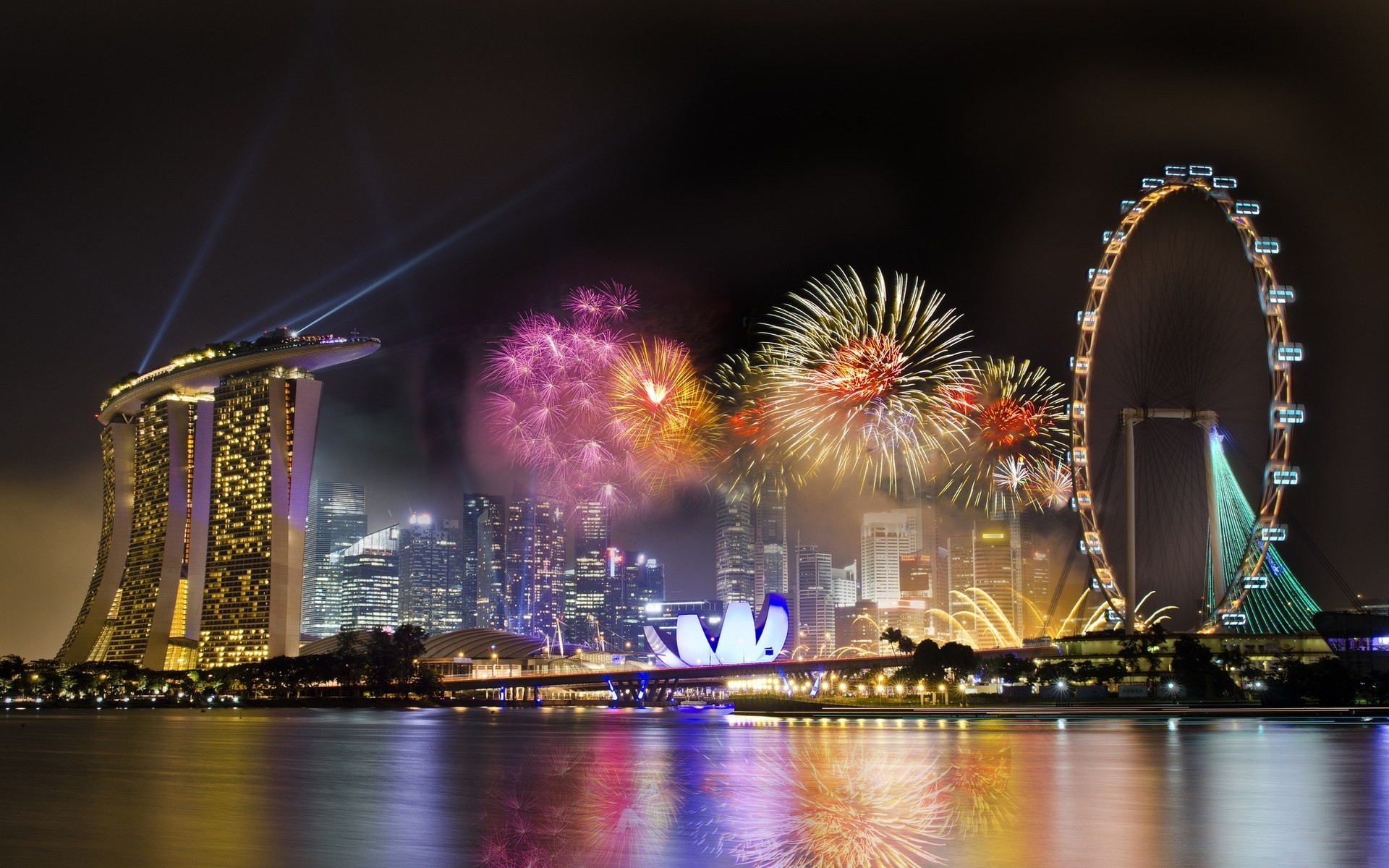 Fuegos artificiales en el fondo de la noria a singapurFuegos artificiales en el fondo de la noria a Singapur