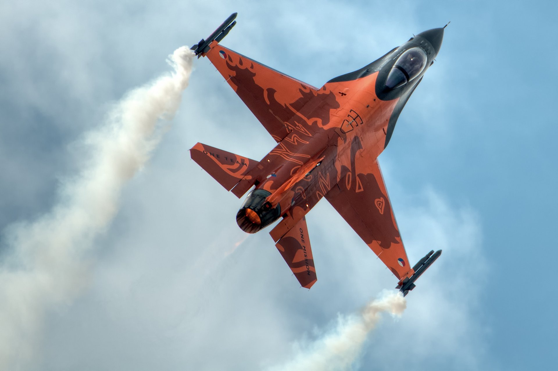 Caza multipropósito f-16" fighting falcon " en color rojo contra el fondo del cielo azul.Caza multipropósito F-16" Fighting Falcon " en color rojo contra el fondo del cielo azul.