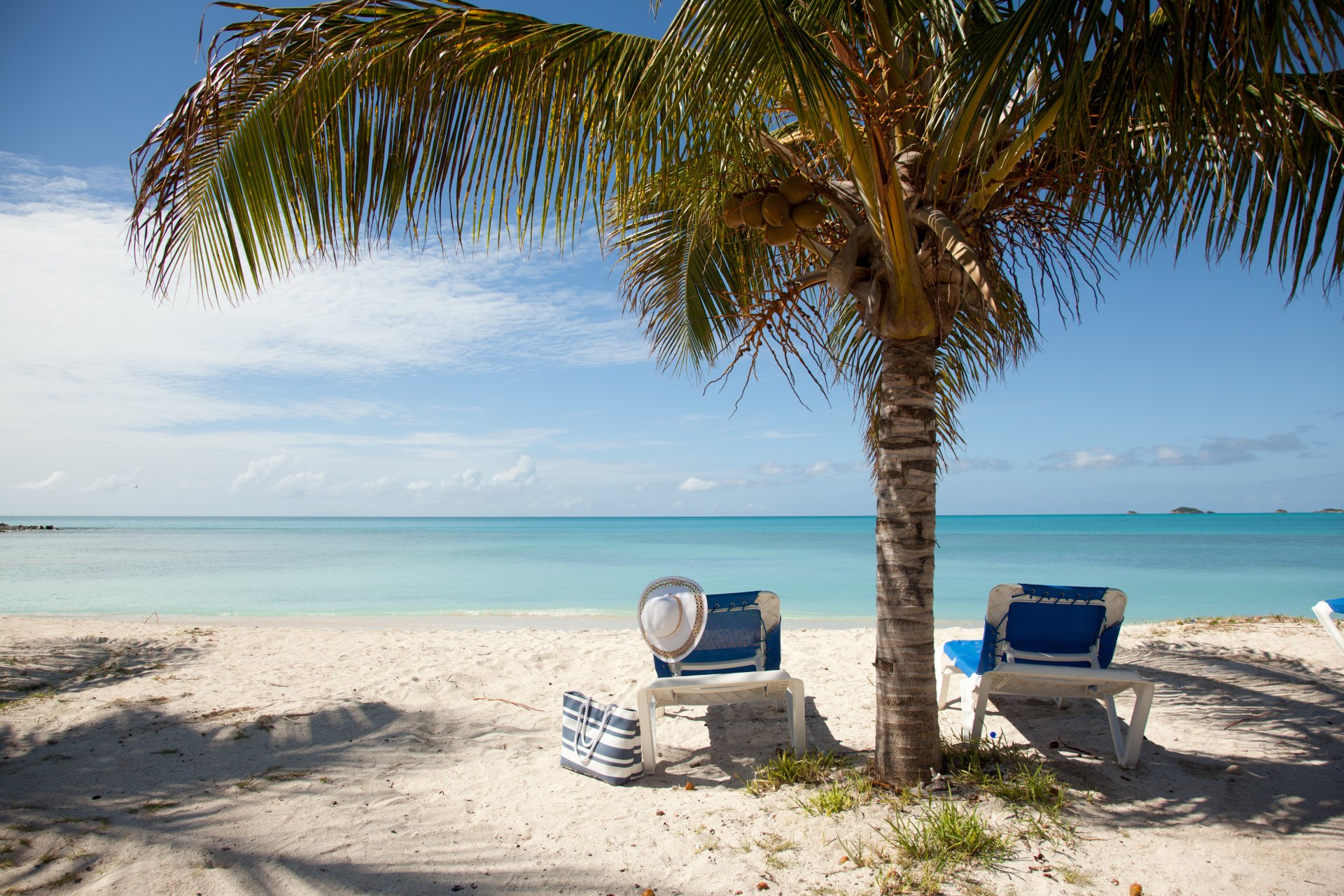 Relajarse en verano en la playa y el sol. La arena es cálida, las palmeras crean sombra