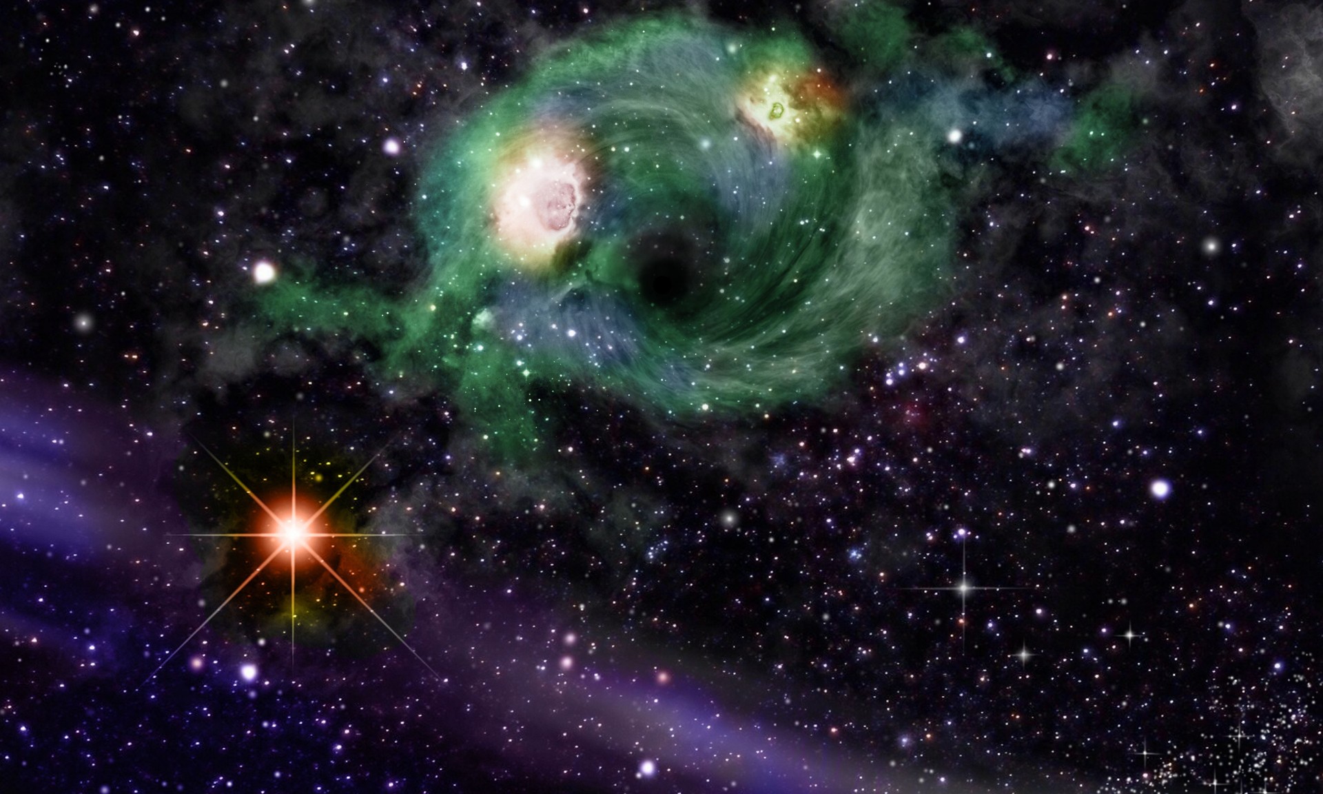 Un objeto volador se acerca a un embudo espacial brillanteUn objeto volador se acerca a un embudo espacial brillante