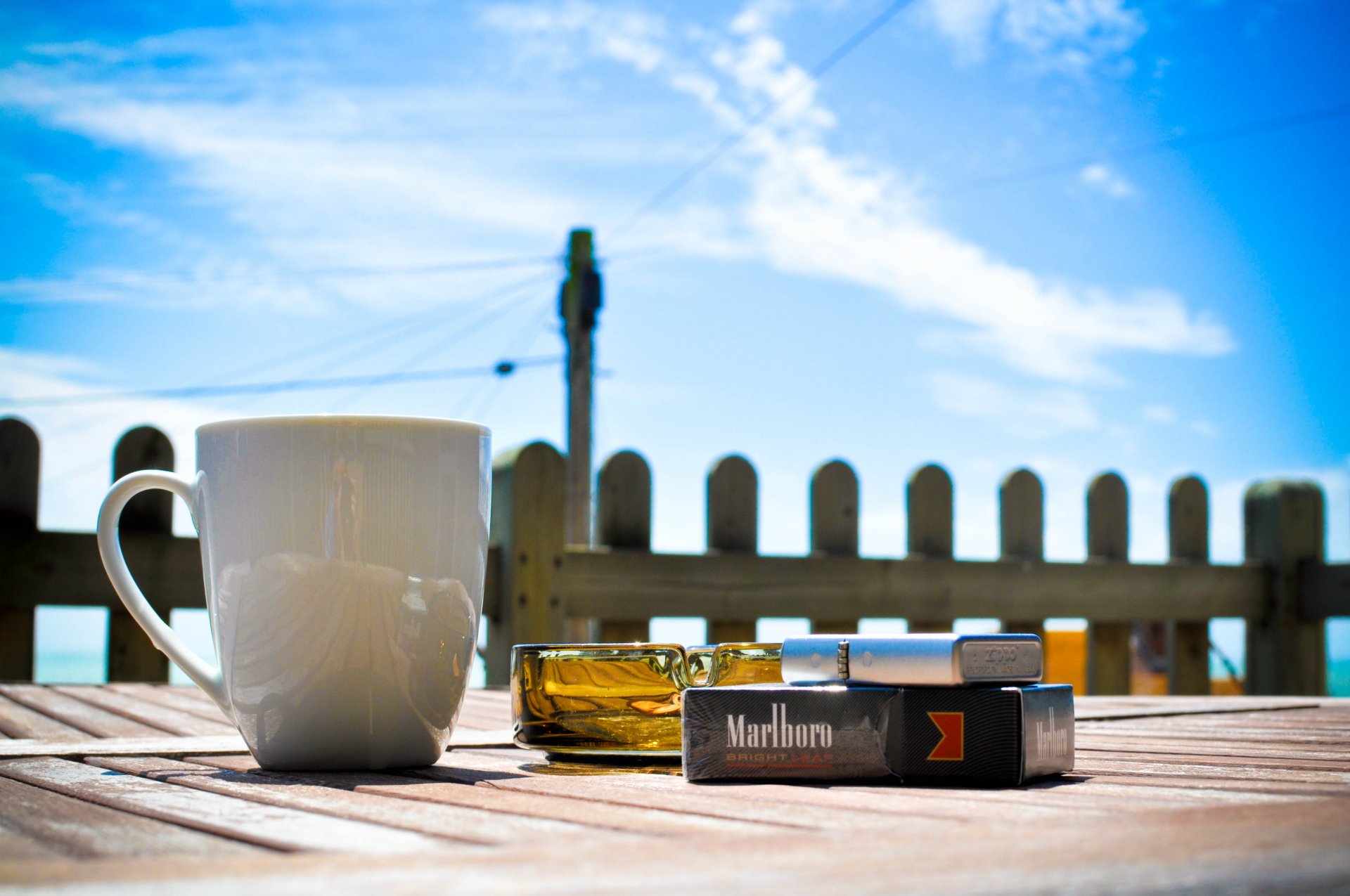 Taza, cenicero, encendedor y cigarrillos contra el cielo azulTaza, cenicero, encendedor y cigarrillos contra el cielo azul