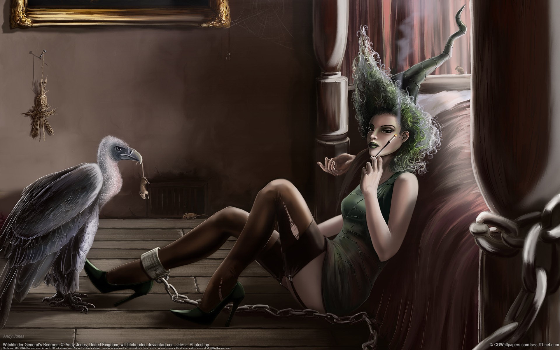Dibujo de una bruja gótica y un buitre