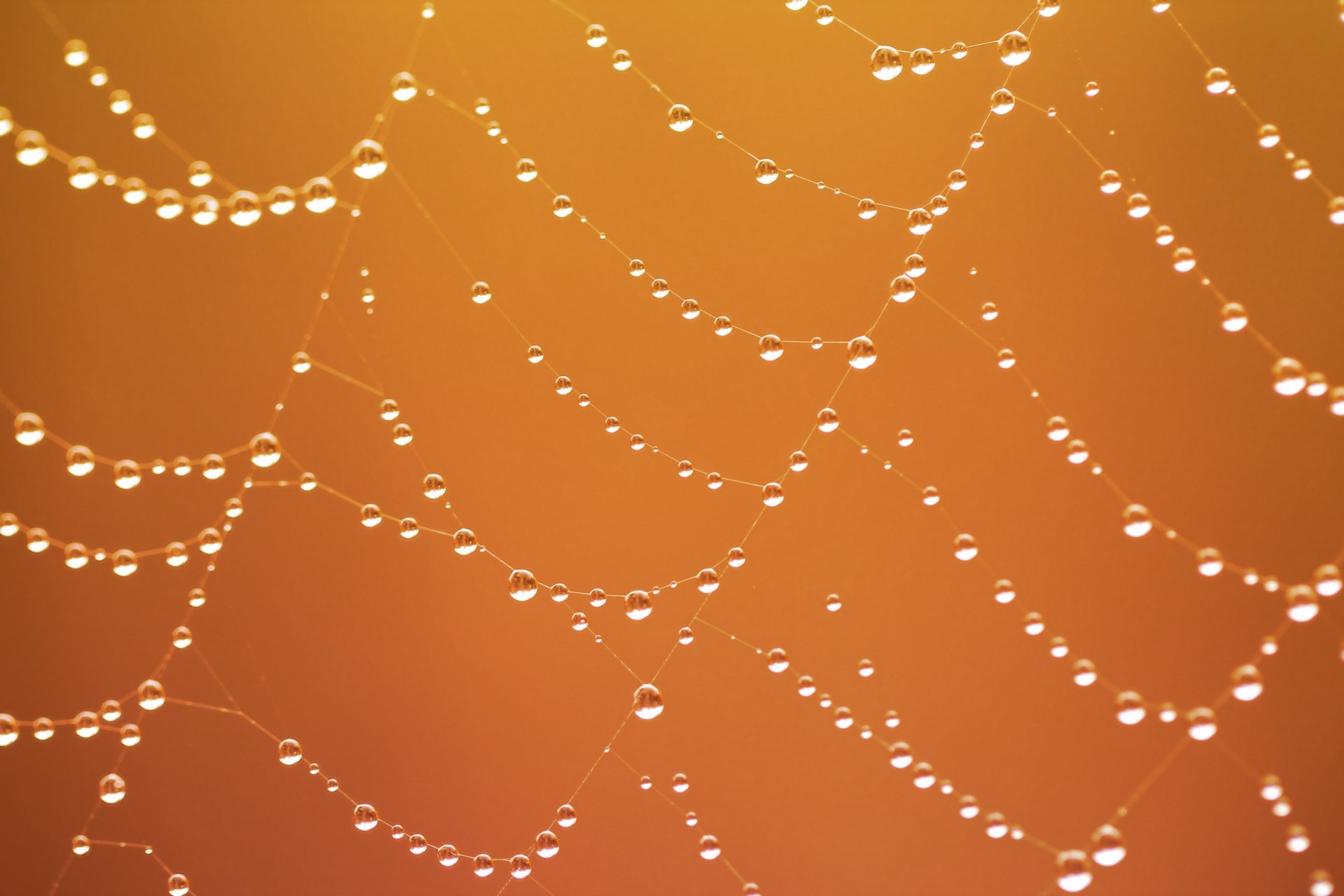 Telarañas en gotas de rocío sobre fondo naranja