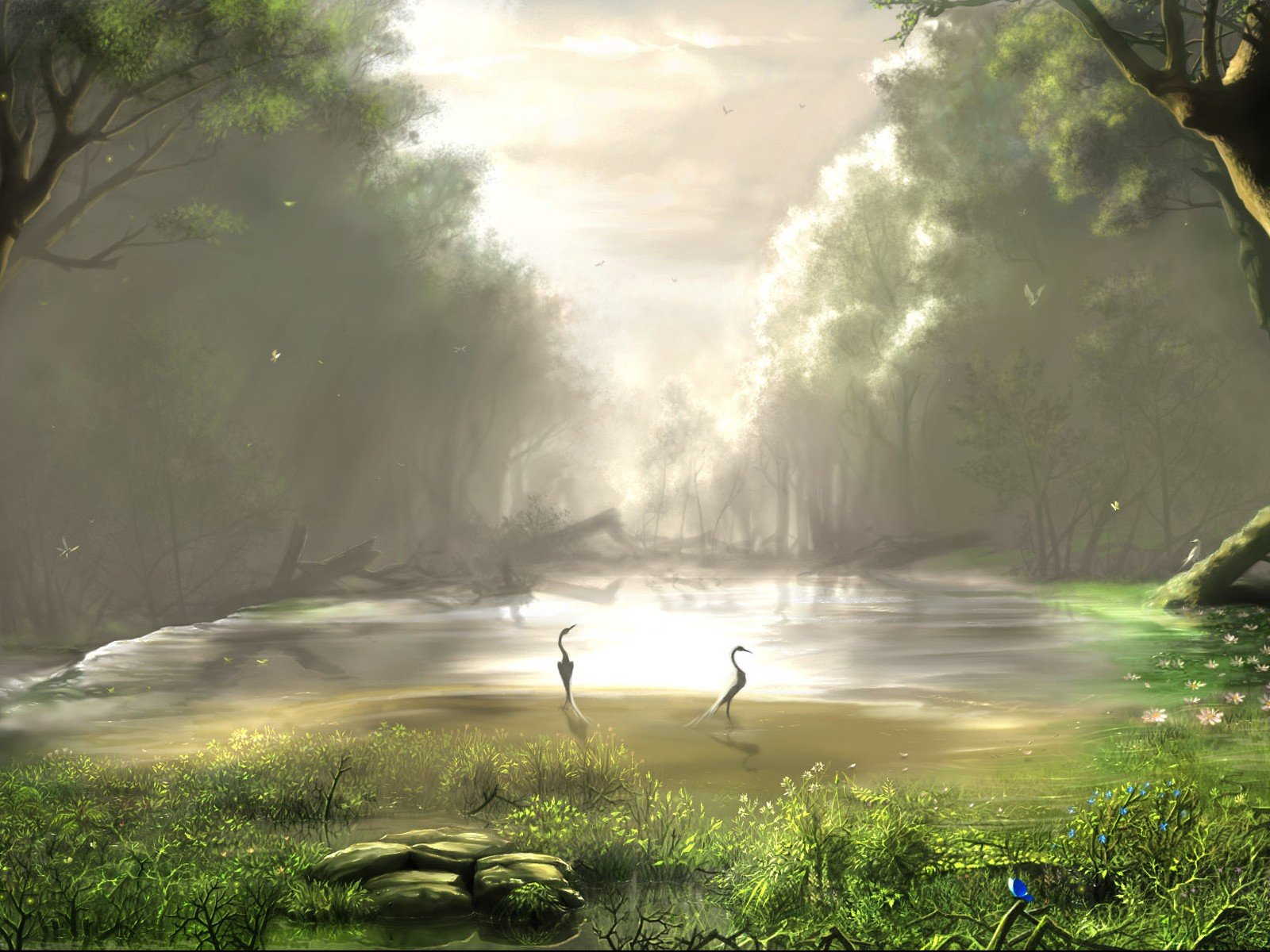 Dibujo de paisaje con aves y bosque
