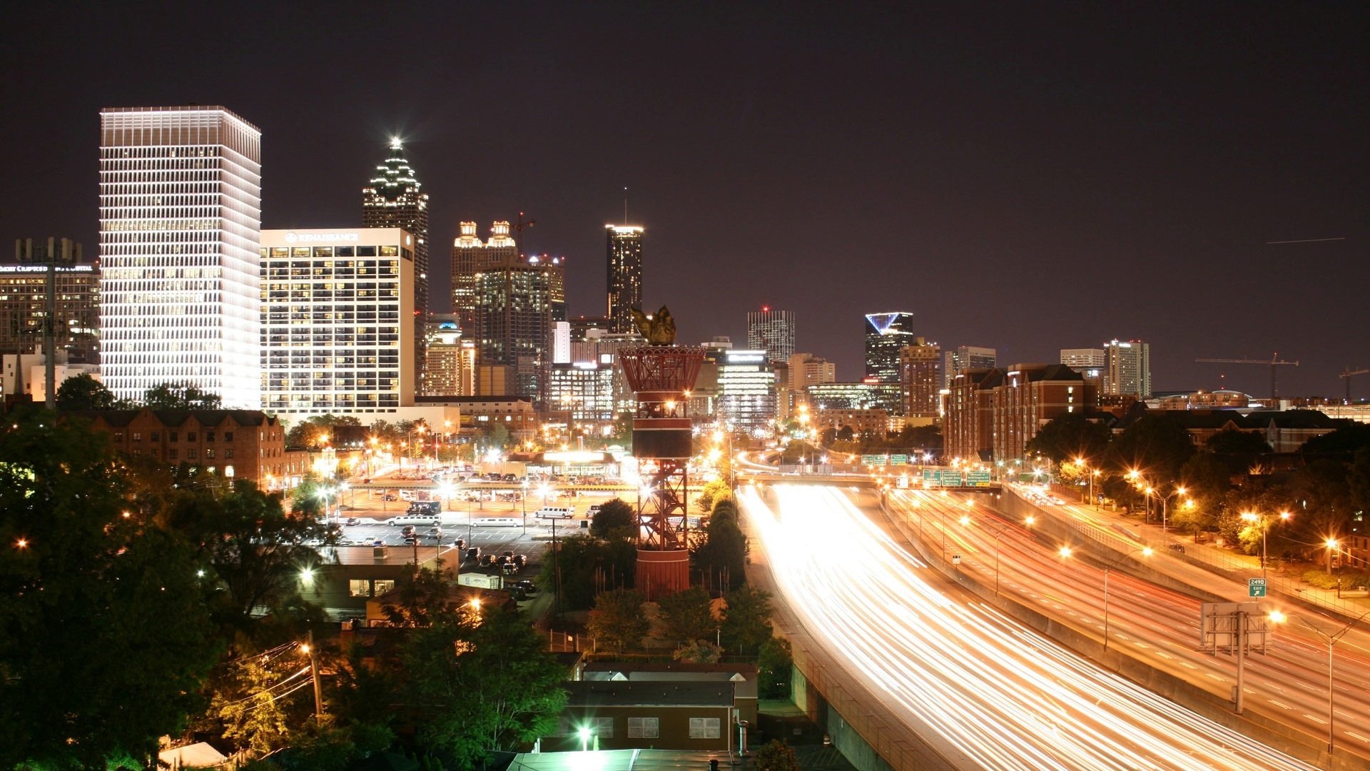 Camino blanco y negro iluminado por las luces de la gran ciudad