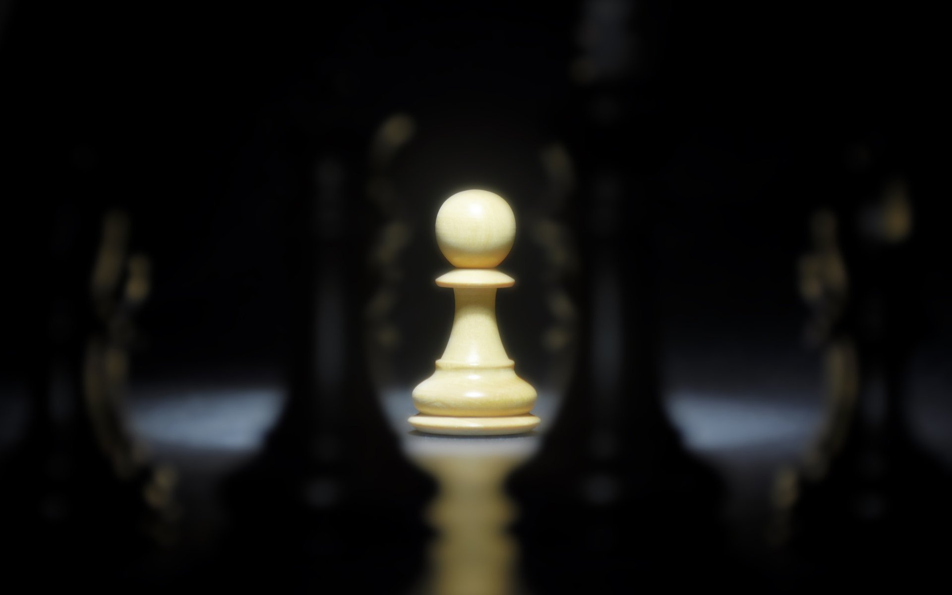Un peón blanco en el tablero de ajedrez entre los negrosUn peón blanco en el tablero de ajedrez entre los negros