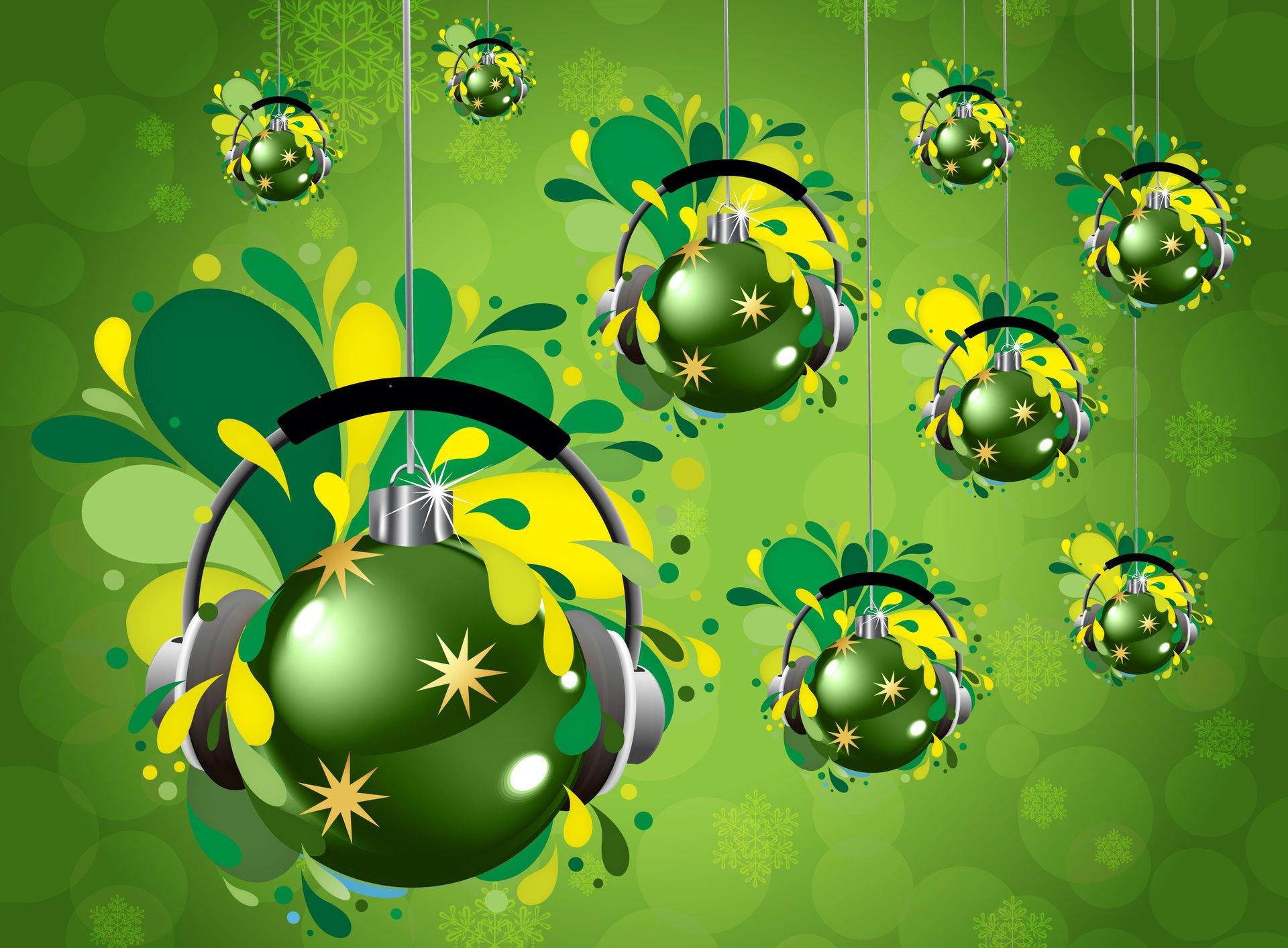Juguetes de navidad con auriculares sobre un fondo verdeJuguetes de Navidad con auriculares sobre un fondo verde