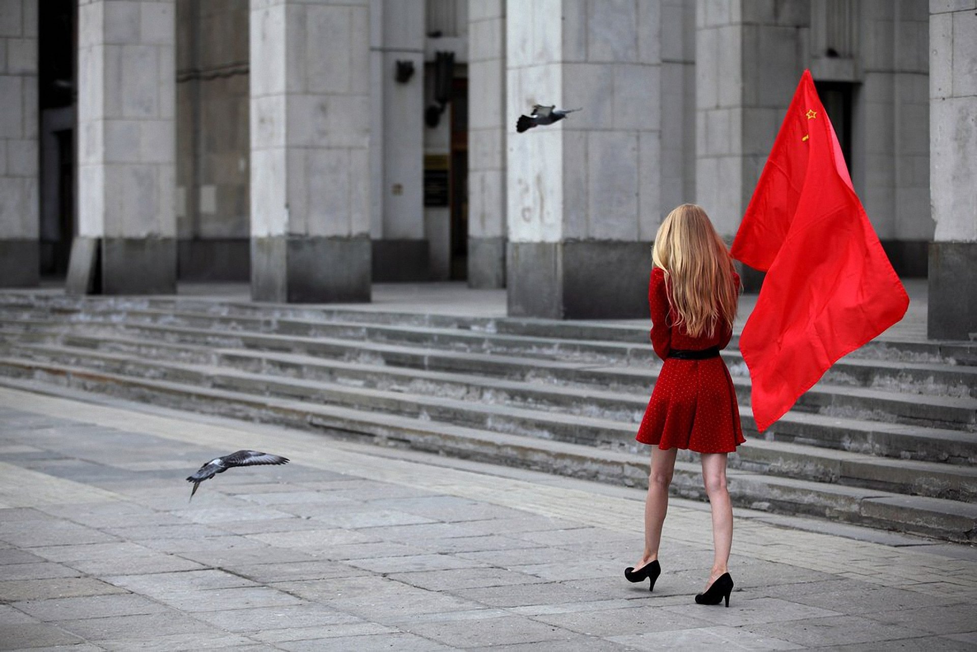 Hermosa chica con bandera y palomas
