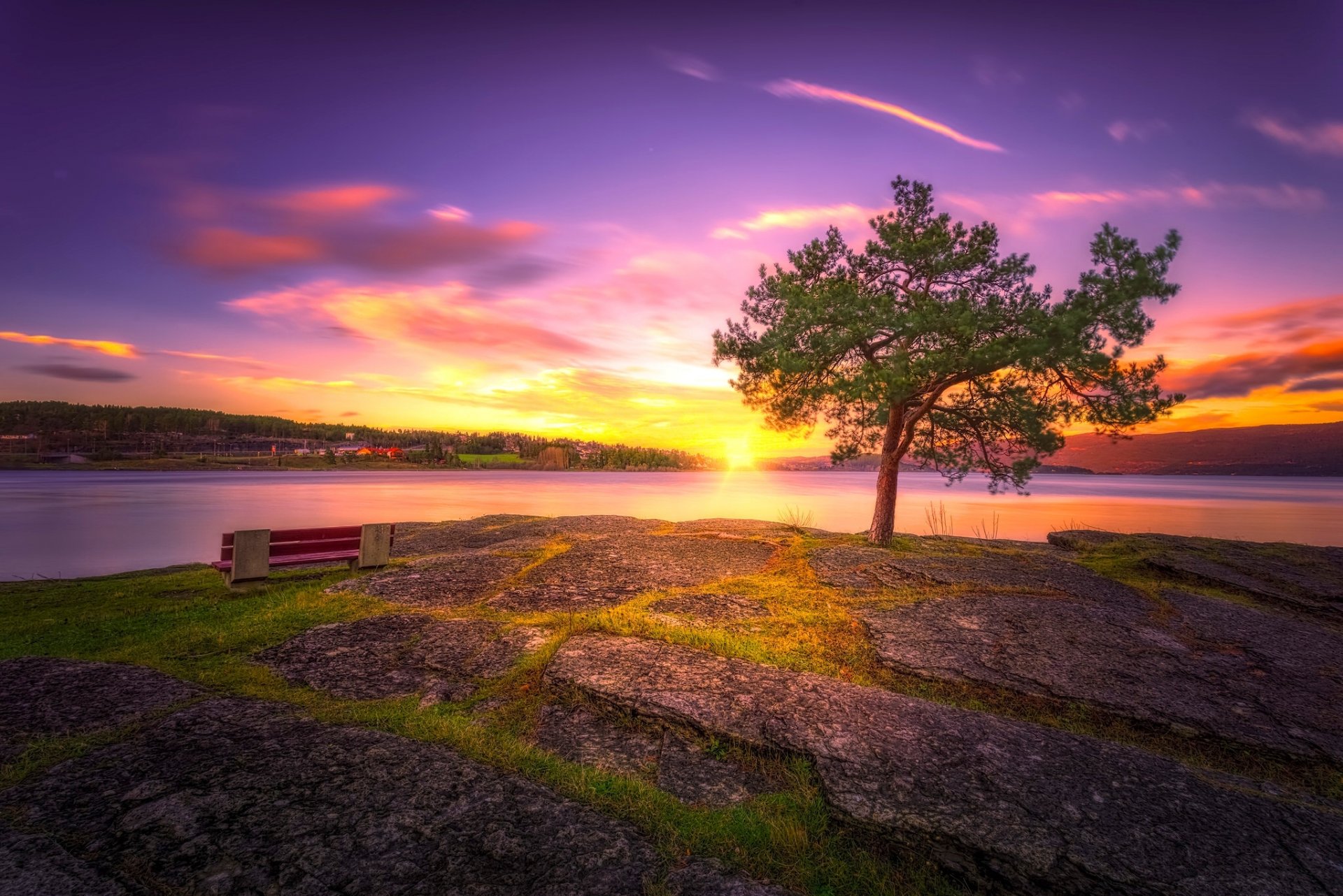 Un árbol solitario en un campo en el fondo de una puesta de sol en el cieloUn árbol solitario en un campo en el fondo de una puesta de sol en el cielo
