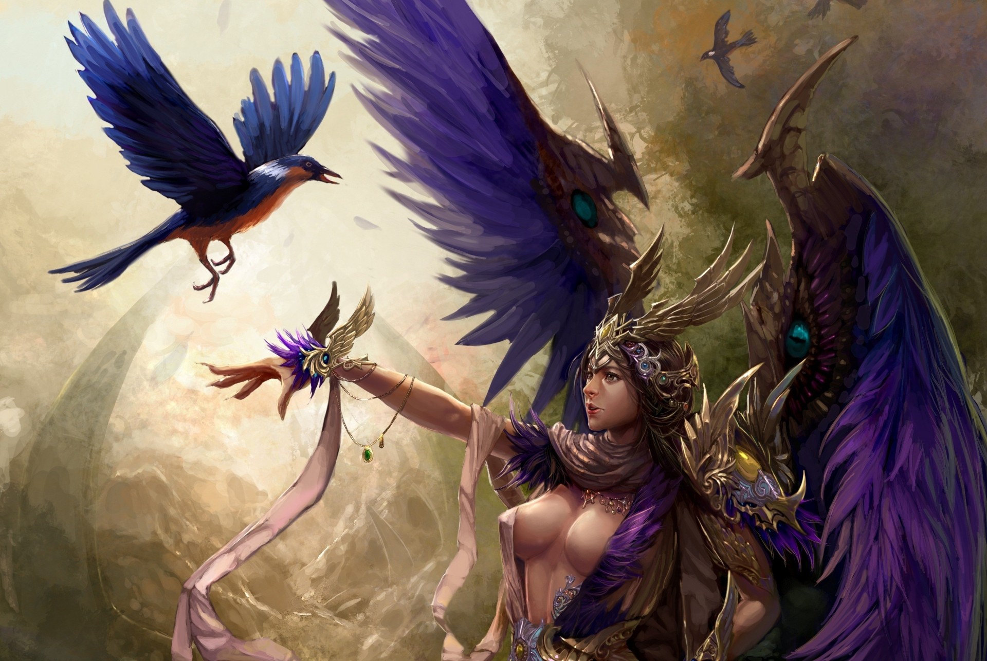 Chica con alas púrpuras en el fondo de los pájarosChica con alas púrpuras en el fondo de los pájaros