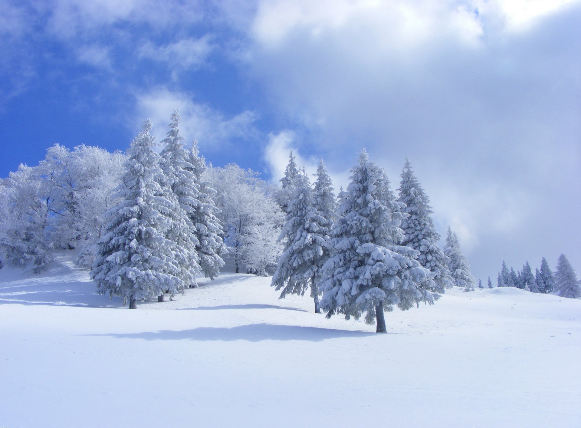 Dos abetos cubiertos de nieve a través de los cuales se puede ver el brillante sol heladoDos abetos cubiertos de nieve a través de los cuales se puede ver el brillante sol helado