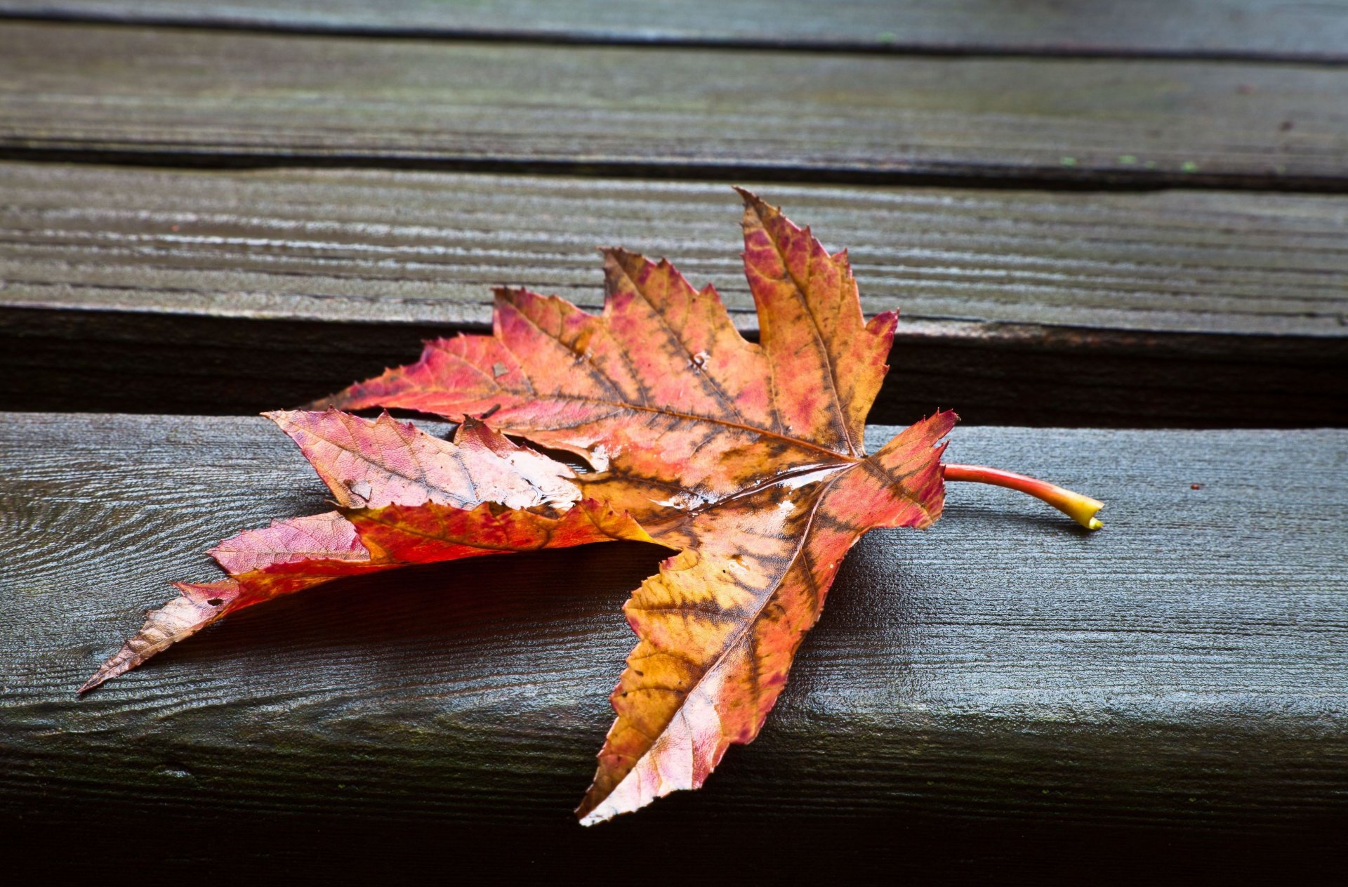 Una hoja de otoño descansa sobre un banco de maderaUna hoja de otoño descansa sobre un banco de madera
