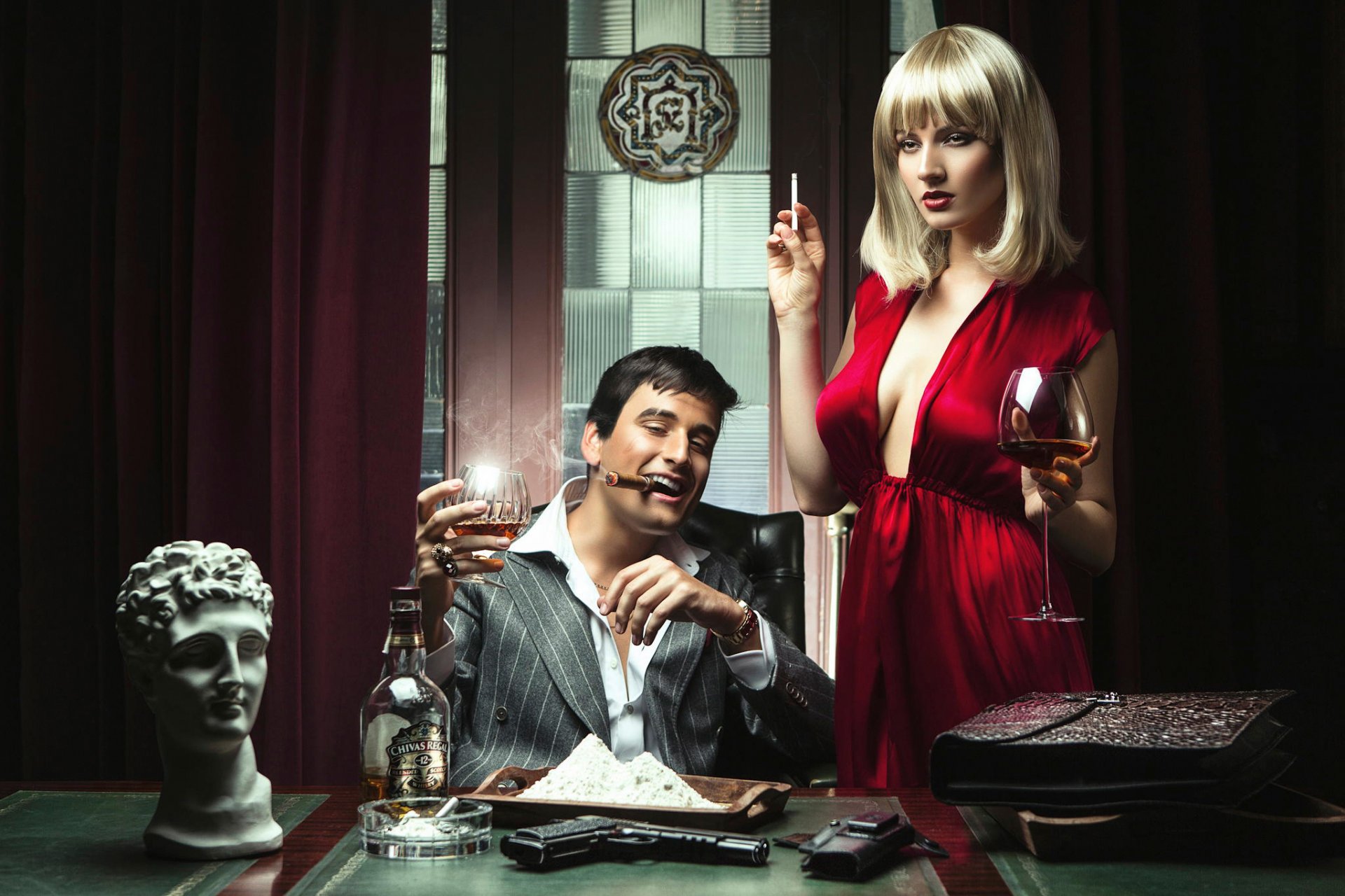 Un hombre fuma un cigarrillo y una chica bebe alcoholUn hombre Fuma un cigarrillo y una chica bebe alcohol